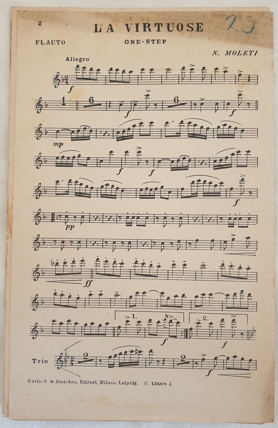 Partitura per orchestra degli anni '20 della melodia "La virtouse" di N. Moleti. Copertina assente. GENERE: One step STRUMENTI: pianoforte, contrabbasso, trombone, flauto, clarino, batteria ANNO: anni '20DIMENSIONI: In 8. cm 27x17 PAGINE: pp. 11 CONDIZIONI: Buone condizioni. Fioriture. Ex libris.Beautiful score of two songs of 1920's, a score for orchestra of the melody "La virtouse" by N. Moleti Cover lacks MUSIC: One step STRUMENTI: piano, contrabass, trombone, flute, clarion, drums<BR>YEAR: 1920's SIZE: In 8. cm 27x17 PAGES: pp. 11 CONDITIONS: Good conditions. Foxing. Ex libris. Tear in the cover