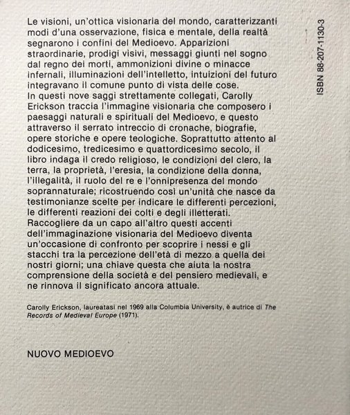 Le visioni, un’ottica visionaria del mondo, caratterizzanti modi d’una osservazione, fisica e mentale, della realtà segnarono i confini del Medioevo. Apparizioni straordinarie, prodigi visivi, messaggi giunti nel sogno dal regno dei morti, ammonizioni divine o minacce infernali, illuminazioni dell’intelletto, intuizioni del futuro integravano il comune punto di vista delle cose. In questi nove saggi strettamente collegati, Carolly Erickson traccia l’immagine visionaria che composero i paesaggi naturali e spirituali del Medioevo, e questo attraverso il serrato intreccio di cronache, biografie, opere storiche e opere teologiche. Soprattutto attento al dodicesimo, tredicesimo e quattordicesimo secolo, il libro indaga il credo religioso, le condizioni del clero, la terra, la proprietà, l’eresia, la condizione della donna, l’illegalità, il ruolo del re e l’onnipresenza del mondo soprannaturale; ricostruendo così un’unità che nasce da testimonianze scelte per indicare le differenti percezioni, le differenti reazioni dei colti e degli illetterati. Raccogliere da un capo all’altro questi accenti dell’immaginazione visionaria del Medioevo diventa un’occasione di confronto per scoprire i nessi e gli stacchi tra la percezione dell’età di mezzo e quella dei nostri giorni; una chiave questa che aiuta la nostra comprensione della società e del pensiero medievali, e ne rinnova il significato ancora attuale.