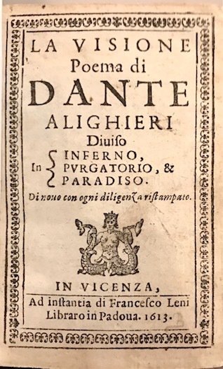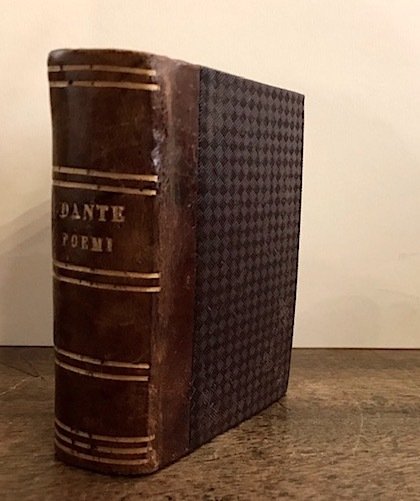 16mo (cm. 10,2), 608 pp., 16 cc.nn. Frontespizio entro cornice tipografica con marca editoriale (sirena bicaudata e coronata). Legatura ‘800 in mz. pelle con fili e titolo impressi in oro al ds. Margine superiore un po’ corto, soprattutto nell’ultima parte del volume. Alcuni minuscoli forellini di tarlo lontani dal testo su poche carte. Nel complesso esemplare in ottimo stato di conservazione. Rarissima edizione, assai ricercata, poiché rappresenta la prima delle sole tre edizioni della Commedia pubblicate nel Seicento, insieme a quelle stampate a Venezia e a Padova nel 1629. Si tratta di un numero di edizioni assai esiguo rispetto ai secoli precedenti, che denota una tendenza regressiva della fortuna dell’opera dantesca, destinata a perdurare fino agli inizi del XVIII secolo. In questo pregevole Dantino, che segna il ritorno all’essenzialità tipografica, essendo privo di commenti e illustrazioni, compare per la prima volta il titolo di ‘Visione’ in luogo di Divina Commedia, che vuole significare ‘il complesso delle cose da lui vedute nel mistico suo viaggio’ (Scartazzini, Enciclopedia Dantesca, II, 2154). Mambelli, ‘Gli annali delle edizioni dantesche’, n. 53; Br. Libr., p. 292.