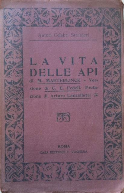 Versione di C. E. Fedeli. Prefazione di Arturo Lancellotti. Casa Editrice C. Voghera, Roma, s.d. (ma 1920 circa). In 8vo, pp. XIII, 272, bross. edit. in carta color vinaccia. Dall'Indice: Sulla soglia dell'alveare - Lo sciame – La fondazione delle città - Le giovani regine – Il volo nuziale – Il massacro dei maschi - Il progresso della specie. Normale patina del tempo ma buona conservazione.