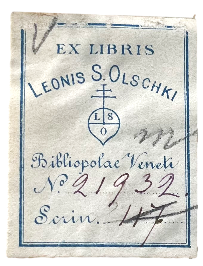 In 8° piccolo (14,5x9,5 cm); (4 b.), 208, (2 b.) pp. Legatura seicentesca in piena pergamena con la versione originale. Tagli spruzzati. Ex-libris all'interno del piatto anteriore che identifica l'esemplare come appartenuto alla collezione personale di Leone Olschki Ex-Libris Leonis S. Olschki Bibliopolae Veneti N° 21932, Scrin. 117. Prima edizione in volgare in ottime condizioni di conservazione di questa celeberrima opera sulla storia di Alfonso I d'Este scritta dal grande vescovo cattolico, storico, medico, biografo e museologo comasco, Paolo Giovio (Como, 21 aprile 1483 Firenze, 12 dicembre 1552). L'opera uscita una prima volta nel 1551 venne tradotta dal noto intellettuale e filosofo fiorentino Giovan Battista Gelli (Firenze, 12 agosto 1498 24 luglio 1563) e stampato da Torrentino nel 1553 nella sua prima versione in volgare. L'opera ebbe notevole successo e diverse edizioni nel corso di tutto il cinquecento. Scrive T. C. Price Zimmermann nella voce dedicata a Paolo Giovio nel Dizionario Biografico degli Italiani, (Treccani, Volume 56, 2001) riguardo ad alcune sue opere: "La vita di Pompeo Colonna contiene molte notizie interessanti, introvabili altrove, così come la vita del marchese di Pescara Ferrante (Ferdinando Francesco) d'Avalos, commissionata da Vittoria Colonna. Queste ultime, insieme con la vita di Gonzalo Hernández de Córdoba, il "gran capitano", e la vita di Alfonso d'Este, sono di grande importanza per la storia militare del XVI secolo e contengono molto materiale che avrebbe dovuto riempire i libri mancanti delle Historiae". Alfonso I d'Este, nato a Ferrara il 21 luglio 1476, fu il terzo duca di Ferrara, Modena e Reggio, ruolo ricoperto dal 1505 fino alla sua morte nel 1534. Figlio di Ercole I d'Este e Eleonora Gonzaga, Alfonso è noto anche come il "duca artigliere" per il suo grande amore per l'arte e l'uso dei cannoni con i quali contribuì a modernizzare le difese del suo ducato. Dopo la morte del padre nel 1505, Alfonso salì al potere in un periodo di forti tensioni politiche e militari. Durante il suo ducato, Alfonso intraprese numerosi conflitti, tra cui la guerra contro Venezia e il Sacco di Roma nel 1527, che causò ingenti danni al suo territorio. È ricordato anche per il suo patrocinio delle arti, favorendo artisti come Dosso Dossi e Ludovico Ariosto, autore dell'Orlando Furioso. La sua vita fu segnata da alleanze strategiche, matrimoni politici e riforme militari, specialmente nel campo delle artiglierie. Alfonso morì il 31 ottobre 1534 a Ferrara, lasciando un ducato culturalmente fiorente e rinomato per la sua architettura e la difesa militare innovativa. La sua figura rimane esempio di duca moderno, che univa arte, cultura e potenza militare. Questo esemplare è appartenuto al grande editore, libraio e collezionista italiano di origini prussiane, Leo Samuele Olschki (nato Lev Samuel Olschki; Johannisburg, 2 gennaio 1861 Ginevra, 17 giugno 1940) che fu uno dei librai più celebri della storia e fra i maggiori valorizzatori del libro antico in Italia ed in Europa. Per i suoi tributi alla cultura italiana fu insignito delle più alte onorificenze d'Italia quali il titolo di Commendatore e quello di Cavaliere di Gran Croce della Corona d'Italia. Per l'assurdità e l'orrore delle leggi razziali fu però costretto all'esilio in Svizzera in quanto ebreo. Bell'esemplare di questa prima edizione italiana e dall'importantissima provenienza. Rif. Bibl.: British Museum p. 303; non in Adams; L. Torrentinus, 1550; Brunet III-584; Sur Jove, voir Michaud XVII-430/435 et sue su Gelli, XVII-40/45; STCI p. 303; D. Moreni, Annali della tipografia fiorentina di Lorenzo Torrentino impressore ducale. Edizione seconda, p. 232-234; Corsivo, romano; segnatura: A-N8; iniziali e fregio xilografici; Edit 16 CNCE 21193.