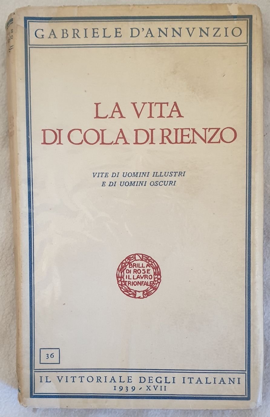 Edizione del 1939 del romanzo "La vita di Cola di Rienzo" dello scrittore, poeta, drammaturgo, politico e giornalista Gabriele D'Annunzio (1863-1938). Volume n. 36 della collana edita dalla fondazione "Il Vittoriale degli italiani". In ottime condizioni. Brossura editoriale in ottime condizioni generali con lievi usure ai margini e dorso. Legatura in buone condizioni. All'interno le pagine si presentano in ottime condizioni con rare fioriture. In 8. Dim. 20,5x12,5 cm. Pp. LXXIX+144+(1). Edition of 1939 of the novel "La vita di Cola di Rienzo" by the writer poet dramawriter politician and journalist Gabriele D'Annunzio (1863-1938).Volume n. 36 of the series edited by the fondation "Il Vittoriale degli italiani". In very good conditions. Editorial cover in very good general conditions lightly worn in the extremities. Binding in good conditions. Inside pages are in very good conditions with occasional foxing. In 8. Dim. 20,5x12,5 cm. Pp. LXXIX+144+(1).