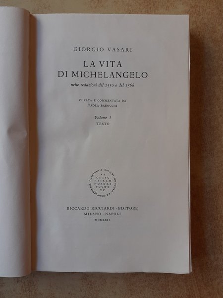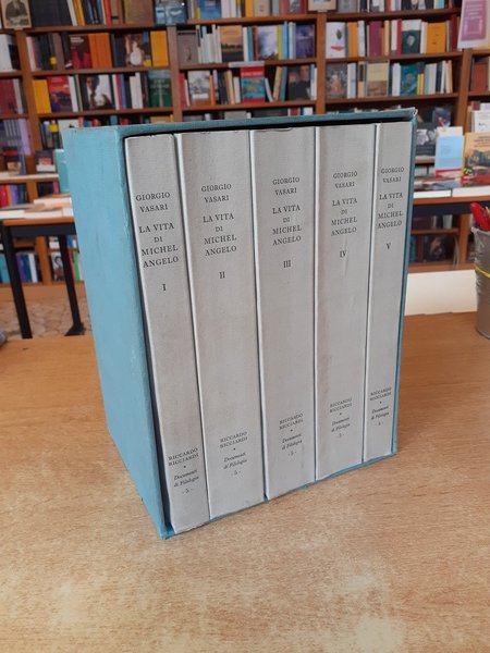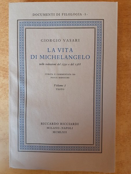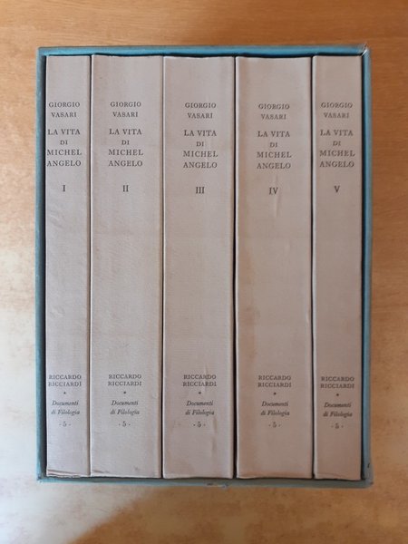 Stampato in 750 esemplari nella stamperia Valdonega di Verona, collana Documenti di Filologia vol. 5, cinque volumi in brossura con cofanetto. Edizione curata e commentata da Paola Barocchi.15x23, intonso tranne le prime pagine del Vol. I.