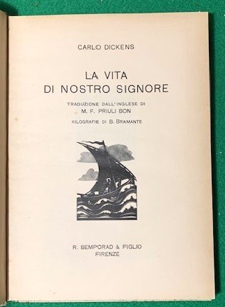 In 4°; 100, (4) pp. Legatrura editoriale con titolo impresso in bianco e nero al piatto anteriore dov'è presente anche una xilografia di Bramante. Prima edizione italiana di questo racconto di Charles Dickens. L'opera venne scritta dal grande scrittore inglese per i suoi figli tra il 1846 ed il 1849. VI è una ragione per la quale questo testo venne tradotto in italiano così tardi, infatti, Dickens lasciò una disposizione testamentaria che prevedeva che il testo non venisse stampato fino a quando tutti i suoi 10 figli fossero morti, quindi il 1933 quandò morì lil minore dei suoi figli. L'opera si così: Cari figli miei, sono molto impaziente di farvi sapere qualcosa della storia di Gesù, perché tutti dovrebbero conoscerla. Non è mai esistito nessuno come Lui, così buono, così gentile, dolce di carattere e compassionevole con i malvagi, i malati o i miserabili. E stando ora in Cielo, dove speriamo di andare [ ], non potrete mai immaginare che luogo splendido sia il cielo senza sapere che è stato Lui a farlo. L'opera fu stampata da Bemporad con una traduzione di Bon Priuli e con xilografie di Bramante. Piccoli difetti al dorso ma nel complesso esemplare in buone-ottime condizioni di conservazione. Rif. Bibl.: IT\ICCU\UBO\0145071.