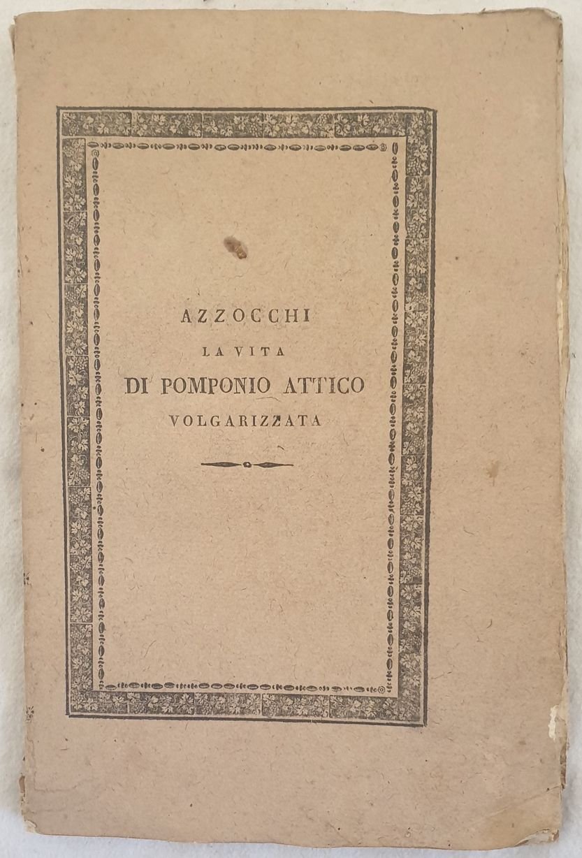 Traduzione italiana del 1824 della vita di Pomponio Attico scritta da Cornelio Nipote. Testo latino con traduzione a fronte a cura di Tommaso Azzocchi (1791-1863) letterato presbitero e traduttore italiano. Azzocchi insegnò lettere dal 1815 al 1825 al Collegio Romano. Celebre traduttore per la scuola di Cornelio Nepote e Fedro, autore di versi d'occasione e celebre come grammatico e lessicografo nbell'ambito della Roma della Restaurazione in cui propugnò il modello lingustico purista di Antonio Cesari. In buone condizioni. Copertina editoriale in buone condizioni generali con lievi usure ai margini e dorso. Legatura in buone condizioni. All'interno le pagine si presentano in buone condizioni con rare fioriture. In barbe. In 8. Dim. 22,5x15 cm. Pp. VI+45+(5).Italian translation of 1824 of the life of Pomponio Attico written by Cornelio Nipote. Latin text with translation and notes by Tommaso Azzocchi (1791-1863) italian letterate and translator. Azzocchi teached letters from 1815 to 1825 al Collegio Romano. In good conditions. Editorial cover in good general conditions lightly worn in the extremities. Binding in good conditions. Inside pages are in good conditions with occasional foxing. Uncut copy. In 8. Dim. 22,5x15 cm. Pp. VI+45+(5).