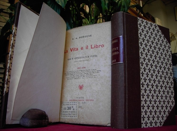 Due volumi in 8, brossure originali conservate e racchiuse in legatura recente in mezza tela con unghie, piatti in carta decorata, titoli al tassello in pelle ai dorsi, occhielli, frontespizi, dedicatoria (la famosa dedica ad Arturo Farinelli 'Pellegrino di tutte le poesie.'), (8) 539 (1) pp., (8) 492 pp. Importante e rara edizione originale di quest'opera emblematica di cultura letteraria, che raccoglie articoli, recensioni, aneddoti biografici e letterari, all'interno del pi vasto e prolifico panorama intellettuale del primo Novecento, di cui l'autore siciliano f una figura di spicco. Profondo conoscitore di lingue e letterature straniere, collabor a numerose riviste e giornali, e si distinse sia nellambiente accademico (fu docente di letteratura tedesca e di estetica a Torino, a Roma e a Milano) sia in quello della cultura militante, dove partecip vivamente al moto di rinnovamento culturale che prese il nome dal Leonardo e dalla Voce, fondando il giornale Hermes (1904), e collaborando alla Stampa ed al Corriere della Sera. Da questo suo lavoro emerge chiaramente tutta la brillantezza critica dell'autore siciliano, capace di ricostruire con grande efficacia i caratteri degli scrittori esaminati, ma soprattutto capace di cogliere ed evidenziare con grande sensibilit le tematiche portanti delle loro opere. In questo senso, basti ricordare che fu proprio Borgese, dalle colonne del quotidiano La Stampa, a coniare quell'espressione fortunata di poesia 'crepuscolare' con la quale ancora oggi designiamo i versi di poeti come Gozzano e Corazzini, tanto per citare i due nomi pi illustri di tale tendenza lirica. In ottimo stato di conservazione. Prima importante e rara edizione.