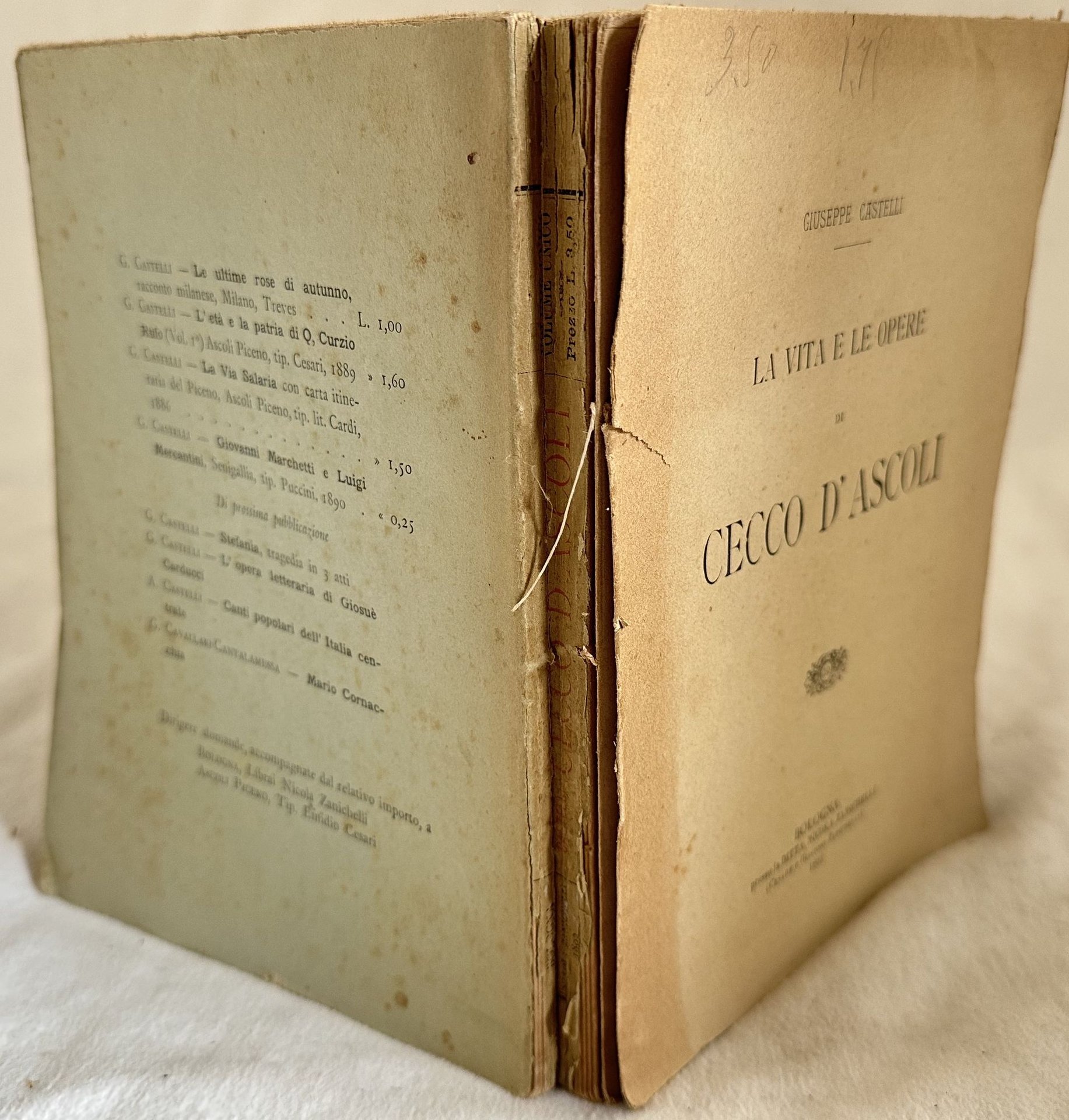 Prima edizione del 1892 di questa biografia del filosofo, astrologo, medico e poeta marchigiano Francesco Stabili, noto come Cecco D'Ascoli, condannato al rogo dall'Inquisizione, scritto da Giuseppe Castelli. Tiratura limitata di 500 esemplari. In appendice bibliografia delle opere dell'autore conservate nelle biblioteche italiane. In discrete condizioni. Copertina editoriale in discrete condizioni con usure e mancanze. Piatto anteriore mancante. Legatura in discrete condizioni con rotture. Pagine in buone condizioni con fioriture. In 8. cm 21x15,5. Pp. 287. First edition of 1892 of this biography by the phylosopher, astrologist, physician and poet from Marche Francesco Stabili, also known as Cecco D'Ascoli,condamned to death by Inquisition, written by Giuseppe Castelli. limited printing of 500 copies. In appendix bibliography of the works of the author kept in italian libraries. In fair conditions. Editorial cover in fair general conditions lightly worn in the extremities. Front plate lacks. Binding in fair conditions with cracks. Inside pages are in good conditions with foxing. In 8. cm 21x15,5. Pp. 287.
