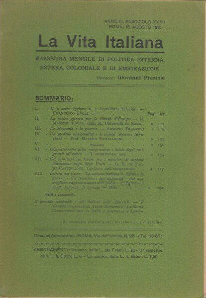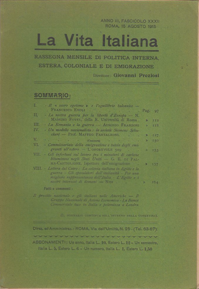 La Vita Italiana Anno III, Fascicolo XXXII Roma, 15 Agosto 1915