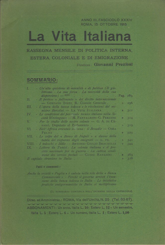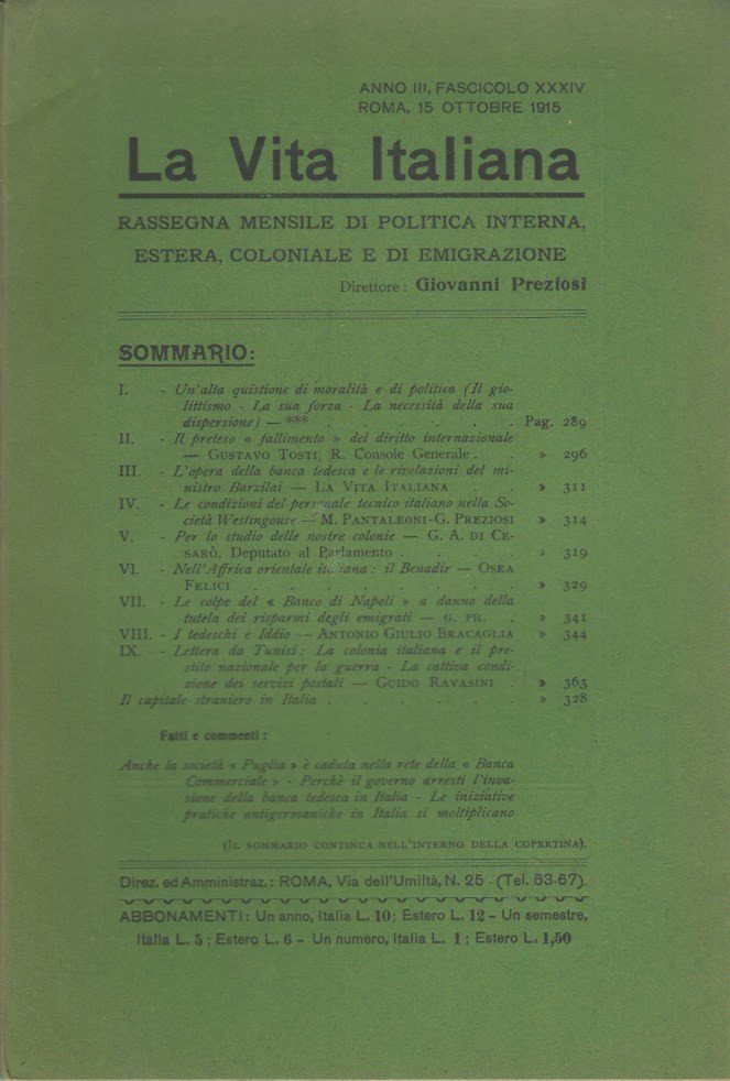 In-8 (Cm 25 x 17), pp. da 290 a 384, brossura editoriale. Pagine ancora intonse. Normali segni del tempo. OTTIMO - Sommario: Un'altra questione di moralità e di politica (Il Giolittismo - La sua forza - La necessità della sua dispersione) - Gustavo Tosti: Il preteso fallimento del diritto internazionale - La Vita Italiana: L'opera della banca tedesca e le rivelazioni del ministro Barzilai - M. Pantaleoni-G. Preziosi: Le condizioni del personale tecnico italiano nella società Westingouse - G.A. di Cesarò: Per lo studio delle nostre colonie - Osea Felici: Nell'Africa orientale italiana: Il Benadir - G.Pr: Le colpe del Banco di Napoli a danno della tutela dei risparmi degli emigrati - Antoio Giulio Bracaglia: I Tedeschi e Iddio - Guido Ravasini: Lettera da Tunisi: La colonia italiana e il prestito nazionale per la guerra, La Cattiva condizione dei servizi postali - Il capitale straniero in Italia - Anche la società Puglia è cadura nella rete della Banca Commerciale - Perchè il governo arresti l'invasione della banca tedesca in Italia - Le iniziative pratiche antigermaniche in Italia si moltiplicano .