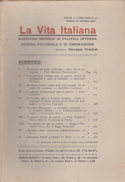 In-8 (Cm 25 x 17,5), pp. da 193 a 288, brossura editoriale. Direttore Giovanni Prezioni. Lieve brunitura margini delle pagine. MOLTO BUONO - Indice: Maffeo Pantaleoni: Desiderata dei popoli d'Europa e forze che li sorreggono - Giovanni Preziosi: L'emigrazione italiana dopo la guerra. Errori di incompetenti e sogni di dilettanti - Agostino Lanzillo: Di alcuni aspetti remoti della crisi europea. La disfatta del socialismo - Civis Italicus: I rapporti internazionali dopo la guerra - Nicola Pascazio: Il Trentino sotto la barbaria austriaca (Dalla rivoluzione di Parigi all'avvento di Francesco Giuseppe) - Francesco Evoli: Le cause della guerra (3 Il fattore economico - 4 il fattore politico - 5 l'interpretazione storica) - Umberto Ricci: Il quarto prestito di guerra - Riccardo Dina: Una pagina di vita in trincea - Stonature della conferenza interparlamentare - Rinnovata attività Germanica in Italia.
