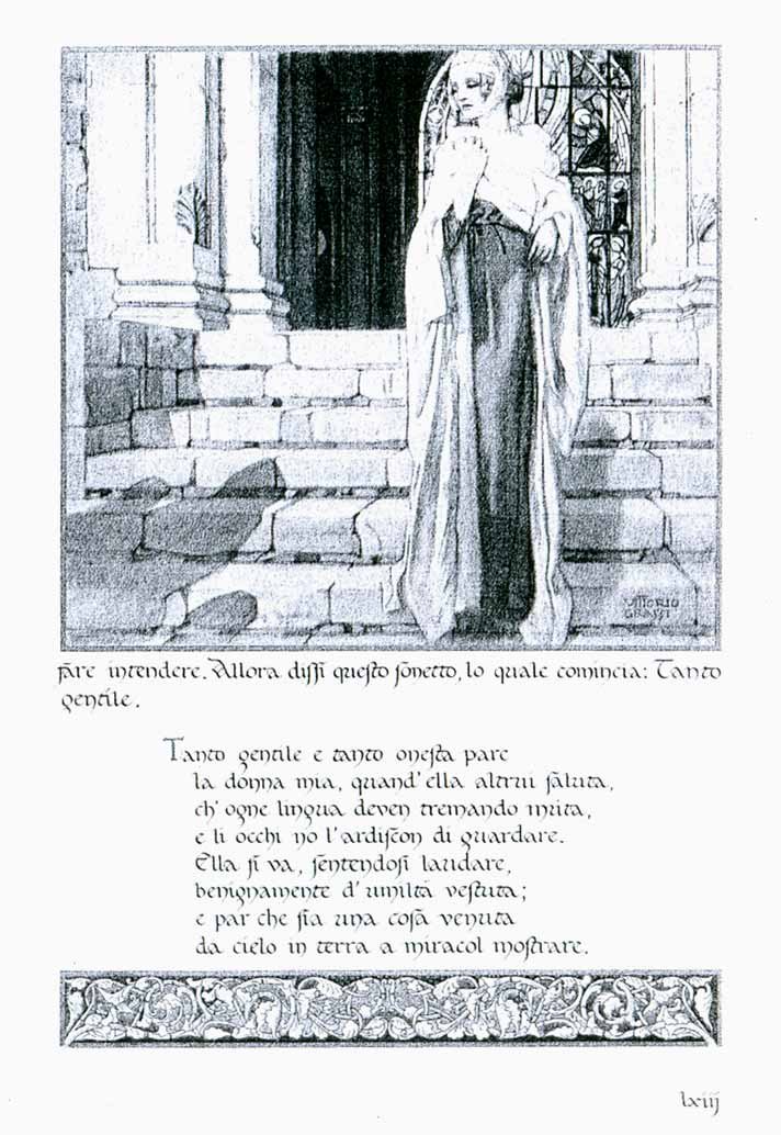 In-4 gr., bella legatura edit. in velluto (abrasioni al dorso), ricca decoraz. oro ai piatti e filetti al dorso, risg. decorati, taglio super. dorato, pp. (10),XCIII,(11), tutte a fogli doppi chiusi; il volume è ornato ai margini di ogni pagina da delicati fregi in oro e a colori di Nestore Leoni, con le bellissime illustrazioni e allegorie a colori di Vittorio Grassi.Riproduzione in fac-simile dell'ediz. originale del 1907 (illustrata e miniata su pergamena da Leoni e Grassi, testo raffermato da Michele Barbi per la Societa' Dantesca Italiana). Cfr. Mambelli,782. Pregevole ediz. di lusso, in tiratura di 1321 esemplare numerati e firmati dagli artisti, su carta avoriata con speciale sigla in filigrana, appositamente fabbricata dalle Cartiere Miliani, ben conservata.