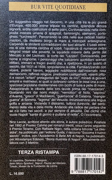 Un suggestivo viaggio nel Seicento, in una città fra le più grandi d'Europa, 400.000 anime stipate tra cantine, splendide dimore signorili, ardite costruzioni di sette piani. Confondendosi nella composita miscela umana di spagnoli, fiamminghi, alemanni, portoghesi, "turcheschi". Percorrendo la città nelle sue radicali trasformazioni, da modesto borgo di mare a metropoli antesignana. Carpendo le stridenti contraddizioni dei suoi abitanti, il lusso estremo di una ristretta cerchia di nobili, l'opulenza di numerosi ordini religiosi votati alla povertà, la squallida miseria della gente del Mercato e del Lavinaio, la corte dei Lazzeri. Conoscendo, per nome e cognome, i personaggi che calcarono quotidiani scenari idilliaci, immani e tragici eventi che, a ripetizione, in un quarto di secolo, dal 1631 al 1656, spopolarono la città. Familiarizzando con viceré, potenti baroni, leggiadre nobildonne dall'incarnato rosa damasceno, raffinati religiosi, predicatori castigamatti, valenti pittori e oscuri artieri protagonisti del "siglo de oro", miriadi di giovani smunti e malmessi, ai quali si potevano contare le ossa una a una, speciose popolane Méditérranée con occhi di luna e pelle di mare. Assaporando le cibarie delle loro tavole prima dei "maccaroni". Gustando vini dai nomi magici, Vernotico di Nola, asprino d'Aversa, greco di Maddaloni, guarnaccia di Calabria, mangia-guerra di Somma, lagrima del Vesuvio. Incuriosendosi alla lingua goffa e arcana. Violando il disincanto, tuttora durevole, del sentimento della vita e della morte. Andando alla radice del parlare che se n'è fatto nei secoli, e pur sempre di attualità. Del cliché che vuole Napoli "santa di giorno e puttana di notte". O l'incontrario.