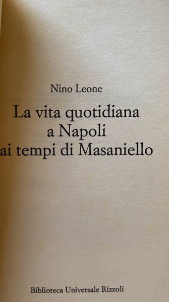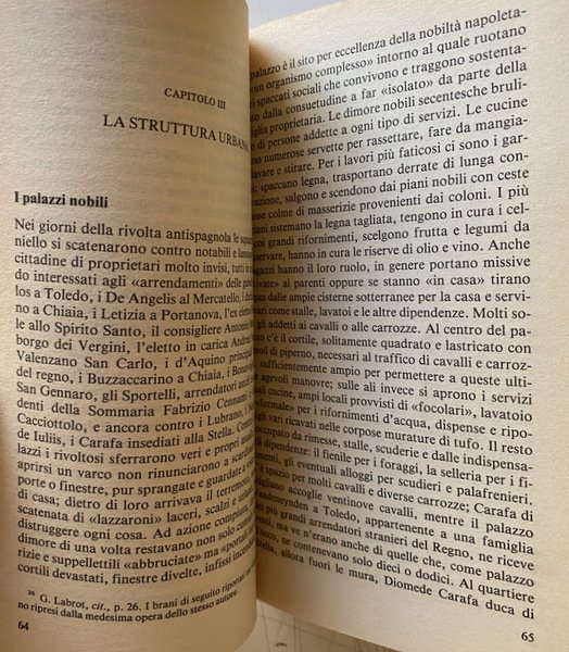 Soggetti: Rivoluzioni, sollevazioni, rivolte, Regno di Napoli, Seicento, Storia moderna, Storiografia, Storia culturale e sociale, Classi sociali, Nobiltà, Popolo, Aristocrazia, Lazzari, Scugnizzi, Vita quotidiana, Sommosse, Capipopolo, Struttura urbana, Urbanistica, Ricostruzioni storiche, Strade, Palazzi nobiliari, Quartieri, Plebe, Porte, Castelli, Seggi, Sedili, Abitazioni popolari, Fognature, Mura, Porto, Fontane, Piazze, Sistema fiscale, Tasse, Dazi, Economia, Erario, Arrendamenti, Mestieri, Artigiani, Botteghe, Lavori, Pesi e misure, Banchi, Poste, Menta, Contrabbando, Mercati, Governo, Famiglie, Reali, Viceré, Amministrazione, Giustizia, Sicurezza, Vita culturale, Teatri, Pittura, Pittori napoletani, Letteratura colta, Musica, Musicisti, Scienze, Università, Chiese, Religione, Monasteri, Riti, Rituali, Consumi, Culti, San Gennaro, Miracolo, Processioni, Fede, Camorra, Gioco, Tarantella, Prostituzione, Tarantolati, Cibo, Alimentazione, Mangiafoglie, Taverne, Vino, Natura, Vulcano, Vesuvio, Eruzioni, Lava, Peste, Epidemie, Malattie, Malgoverno, Spagna, Masaniello, Piazza Mercato, Commercio, Grano, Decumani, Porta Capuana, Stratificazione, Congreghe, Fondazioni, Mariuoli, Nobili decaduti, Roberto Bracco, Nicola Pugliese, Borbone, Tommaso Aniello, Guerra, Assalti, Campanile, Festa della Madonna, Biografie, Saggistica, Libri Vintage Fuori catalogo, Libri rari, Collezionismo, Personaggi, Maschere, Zeza, Pulcinella, Folklore, Meridionalismo, Van Dyck, Terra di lavoro, Velázquez, Thiene, Tasso, Pedro de Toledo, Sanseverino, Vajasse, Rivolta antispagnola, Spagnoletto, Ribera, Ruffo, Caravaggio, Nola, Nocera, Pignatelli, Montella, Monteleone, Olivares, Naclerio, Micco Spadaro, Tommaso Aniello d'Amalfi, Guevara, Artemisia Gentileschi, Celano, Del Tufo, Filomarino, Federico, Ferrante, Aragona, Domenico Fontana, Flagellazione di Cristo, d'Avalos, Giambattista Basile, Bisignano, Montesarchio, Brancaccio, Giordano Bruno, Tommaso Campanella, Caracciolo, Carafa, Capaccio, Angiò, Cariati, Capodimonte, Capua, San Martino, Stigliano, Ruffo, Aragona, Revolutions, uprisings, revolts, Kingdom of Naples, Seventeenth century, Modern history, Historiography, Cultural and social history, Social classes, Nobility, People, Aristocracy, Daily life, Riots, Population leaders, Urban structure, Urban planning, Historical reconstructions, Streets, Palaces, Neighborhoods, Plebs, Doors, Castles, Seats, Public housing, Sewers, Walls, Port, Fountains, Squares, Tax system, Taxes, Duties, Economy, Treasury, Surrenders, Professions, Craftsmen, Shops, Works, Weights and measures, Counters, Posts, Mint, Smuggling, Markets, Government, Families, Royals, Viceroy, Administration, Justice, Security, Cultural life, Theaters, Painting, Neapolitan painters, Cultured literature, Music, Musicians, Sciences, Universities, Churches, Religion, Monasteries, Rites, Rituals, Consumption, Cults, Miracles, Processions, Faith, Game, Prostitution, Food, Nutrition, Leaf Eater, Taverns, Wine, Nature, Volcano, Vesuvius, Eruptions, Plague, Epidemics, Diseases, Misgovernment, Spain, Commerce, Grain, Congregations, Foundations, Mariuoli, Decayed Nobles, War, Assaults, Bell Tower, Feast of the Madonna, Biographies, Non-fiction, Out of print books, Rare books, Collectibles, Characters, Masks, Southernism, anti-Spanish revolt, Flagellation of Christ
