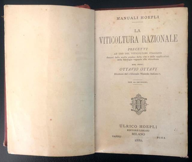 Hoepli, Milano, 1880. In 12esimo, pp. VIII (con Indice e Prefazione Al Lettore) 168 + 11 di Bibliografia antifilosserica, con 22 incisioni in legno in b/n n. t., leg. orig. in cartonato color mattone caratteristico di questi manualetti. Una piega verticale al piatto anteriore con difetti di allentamento del dorso. Ciò nonostante il volumetto risulta di piacevole maneggevolezza, discreto stato.