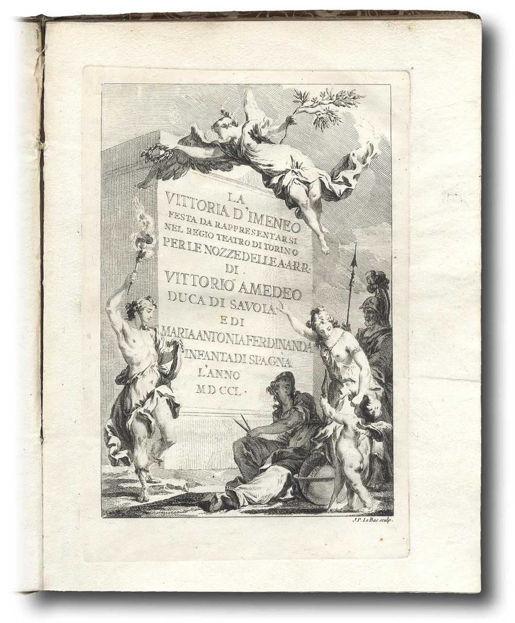 >in-4, pp. 102, (2 bianche), bella legatura coeva in carta decorata con ramages bianchi su fondo oro. Prima edizione di questa rappresentazione scenica in tre parti, per la musica del noto compositore Baldassarre Galuppi, eseguita al Teatro Regio di Torino nel 1750 in occasione delle nozze del Duca di Savoia Vittorio Amedeo ((1726-1796) con l'Infanta di Spagna Maria Antonia Ferdinanda (1729-1785), celebrate ad Oulx il 31 maggio dello stesso anno. E' illustrata da titolo con figure allegoriche inc. da Jacques Philippe Le Bas, 2 testatine, 2 iniziali, 1 finaletto e 3 magnifiche finissime tavole su doppio foglio f.t. costituenti le scenografie disegnate dai fratelli Galliari (Bernardino, Fabrizio e Giovanni Antonio) ed incise dallo stesso Le Bas. Creatore dei costumi è Franc. Mainino e principale interprete nel ruolo di Imeneo il celebre ''castrato'' Gaetano Majorana Caffarelli. Il Bartoli fu autore di altre analoghe feste teatrali, quale, ad esempio, ''Le tre Dee riunite'' composta per le stesse nozze e pubblicata poco prima della presente. Ottimo esempl. di opera censita in sole 4 Biblioteche Pubbliche (2 a Torino, Nazionale ed Arcivescovile, e due a Roma). Cicognara 1516. Manca a Ruggieri e Vinet.