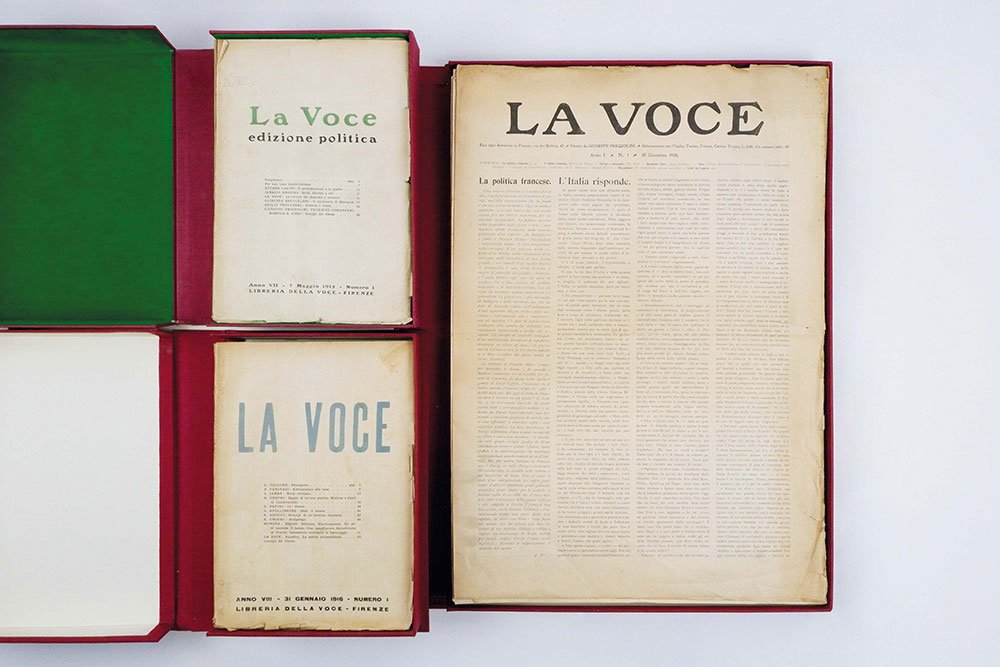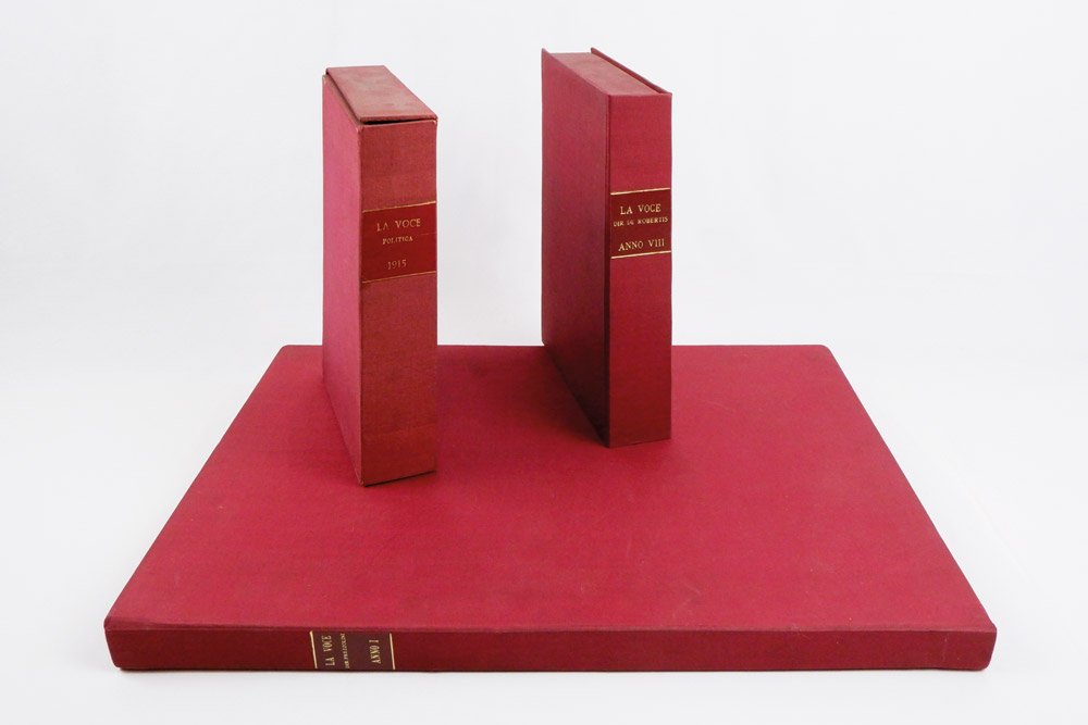 PERIODICOEdizione originale.Collezione completa, comprensiva di «La Voce Politica» conservata in due cofanetti, mancante dei soli numeri 3, 4 e 8 dell’Anno I, del numero 47 dell’Anno IV e dei numeri 6, 51 e 52 dell’Anno V. Fascicoli sciolti complessivamente in buono stato.Fondamentale rivista fondata nel 1908 a Firenze da Giuseppe Prezzolini e Giovanni Papini e diretta quasi ininterrottamente dallo stesso Prezzolini (fatta eccezione per l’aprile-ottobre del 1912 in cui la direzione fu presa da Papini e per l’ultimo biennio di attività 1914 - 1916 retto da Giuseppe De Robertis). Estremamente attenta anche a problemi di ordine politico e sociale – manifestando particolare sensibilità per l’alfabetizzazione, lo stato della scuola e per la questione meridionale -, «La Voce» fu per 8 anni una fucina di elaborazione e divulgazione letteraria, artistica e culturale in senso ampio che ospitò contributi da alcuni tra i nomi più importanti e autorevoli del panorama italiano del tempo: dagli interventi di Croce, Amendola, Salvemini, Einaudi alle parole di Slataper, Michelstaedter, Boine, Stuparich, Sbarbaro, Rebora, Campana, Ungaretti. Sorretta – come testimonia la presenza di Benedetto Croce – da una forte vocazione antipositivista e filoidealista, la rivista – che avrebbe dato vita anche a storici progetti editoriali, come le “Edizioni della Voce”, i “Quaderni della Voce” e la “Libreria della Voce” – non mancò di essere attraversata da tensioni e infine da divisioni insanabili che avrebbero, ancor prima della chiusura nel 1916, condotto all’allontanamento di due figure fin lì centrali, ovvero il co-fondatore Giovanni Papini e Ardengo Soffici. Nel 1913, infatti, in aperta polemica ormai con l’impostazione estetica e valoriale vociana, i due avrebbero dato vita al quindicinale «Lacerba».
