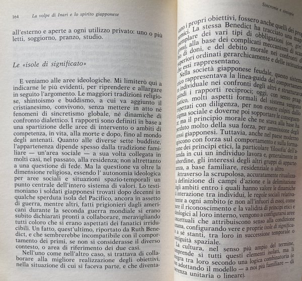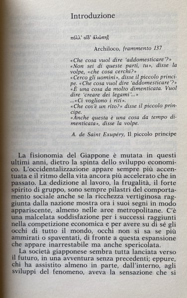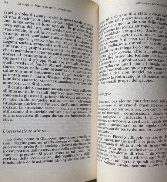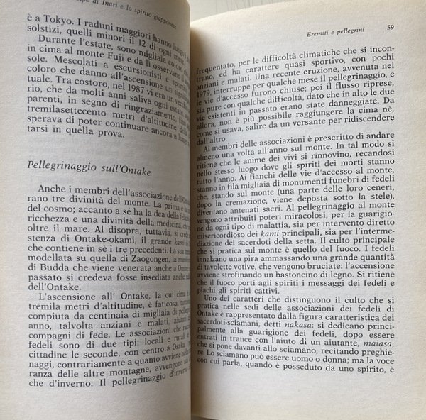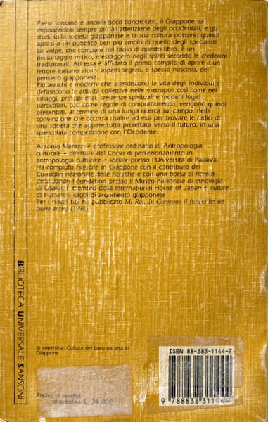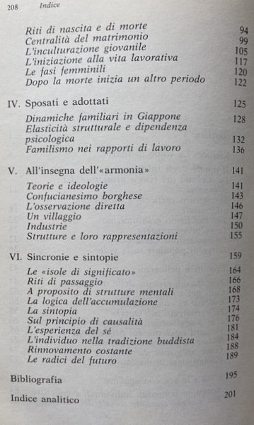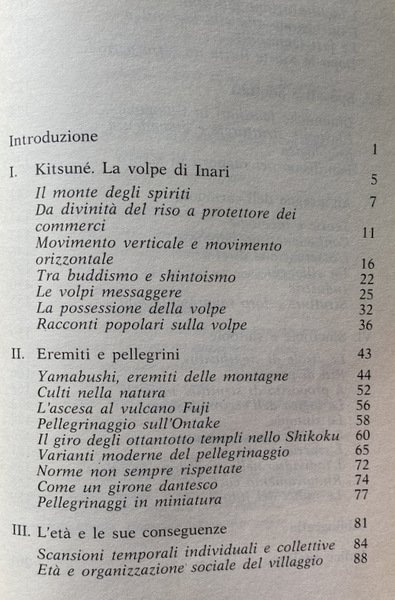 Soggetti: Storia dell'Asia, Studi culturali e sociali, Cultura Giapponese, Filosofia Orientale, Giappone moderno, Orientalistica, Oriente, Società, Credenze tradizionali, Pensiero Giapponese, Tradizione, Scrittura, Mitologia, Miti giapponesi, Anima, Folklore, Credenze popolari, Antropologia culturale, Riti, Rituali, Usi e costumi, Occidentalizzazione, Modernità, Spiriti della montagna, Pianura, Yama no kami, Kitsune, Volpe, Protezione, Divinità, Riso, Commercio, Buddhismo, Scintoismo, Religione, Racconti popolari, Letteratura, Eremiti, Eremitaggio, Pellegrinaggio, Pellegrini, Culti, Natura, Montagne, Ontake, Fiumi, Vulcani, Vulcano Fuji, Shikoku, Masturi, Ottantotto templi, Villaggio, Organizzazione sociale, Famiglia, Nascita, Morte, Matrimonio, Etnografia, Cerimoniale, Cerimonie, Feste, Dinamiche familiari, Ideologia, Borghesia, Iniziazione, Giovani, Lavoro, Familismo, Confucianesimo, Elasticità, Mentalità, Psicologia, Isole di significato, Strutture mentali, Passaggio, Sintopia, Accumulazione, Causalità, Esperienza, Individuo, Collettività, Dovere, Rispetto, Donne, Riferimento, Bibliografia, Libri rari Vintage fuori catalogo, Saggistica, Collezionismo, Rarità, Introvabili, Ascetismo, Buddha, Feudalesimo, Honke, Hata, Dozoku, Dakini, Enno Gyojia, Fushimi, Società feudale, van Arnold Gennep, Identità, Ideogrammi, Illuminazione, Inculturazione, Individualismo, Imperatore, Kami, Karma, Kazoedoshi, Dinastie, Meiji, Kukai, Kyoto, Kobo Daishi, George Murdock, Hajime Nakamura, Primogenitura, Possessione, Parentela, Shugendo, Scuola, Samurai, Paul Radin, Sacerdoti, Struttura piramidale, Spirito, Takao, Taoismo, Zen, Tonari gumi, Tsuka, Yamabushi, Max Weber, Zaou-Gongen, Tokugawa, Antenati, Roland Barthes, Confucio, Tokyo, Nakasa, Sciamanesimo, Eruzioni, Religione, Montagne, Viaggio, Saito goma, Ascesa, Fuoco, Sacralità, Medioevo, Restaurazione, Anziani, Samurai, Patriarcato, Adozione, Capofamiglia, Morti, Bunke, Kimono, A. Marazzi, Bernardi, Sociologia, Shingon, Esoterismo, Grande Veicolo, Ruth Benedict, Elisabeth B. Dufourcq, René Duchac, K. Hashimoto, Claude Levy-Strauss, Mistica, Misticismo, Clan, En no Gyōja, Manga, History of Asia, Cultural and Social Studies, Japanese Culture, Oriental Philosophy, Modern Japan, Oriental Studies, Orient, Society, Traditional Beliefs, Japanese Thought, Tradition, Writing, Mythology, Japanese Myths, Soul, Popular Beliefs, Cultural Anthropology, Rites, Rituals, Customs, Westernization, Modernity, Spirits of the mountain, Plain, Fox, Protection, Divinity, Rice, Commerce, Buddhism, Shinto, Religion, Folk tales, Literature, Hermits, Hermitage, Pilgrimage, Pilgrims, Cults, Nature, Mountains, Rivers, Volcanoes, Volcano, Eighty-eight temples, Village, Social organization, Family, Birth, Death, Marriage, Ethnography, Ceremonial, Ceremonies, Parties, Family dynamics, Ideology, Bourgeoisie, Initiation, Youth, Work, Familism, Confucianism, Elasticity, Mentality, Psychology, Islands of meaning, Mental structures, Passage, Syntopia, Accumulation, Causality, Experience, Individual, Collectivity, Duty, Respect, Women, Reference, Bibliography, Out-of-print rare books, Non-fiction, Collectingism, Rarities, Hard to find, Asceticism, Feudalism, Feudal society, Identity, Ideograms, Illumination, Inculturation, Individualism, Emperor, Dynasties, Primogeniture, Possession, Kinship, School, Priests, Pyramid Structure, Spirit, Taoism, Ancestors, Confucius, Shamanism, Eruptions, Religion, Mountains, Travel, Ascent, Fire, Sacredness, Middle Ages, Restoration, Elders, Patriarchy, Adoption, Breadwinner, Dead, Sociology, Esotericism, Great Vehicle, Mystique, Mysticism