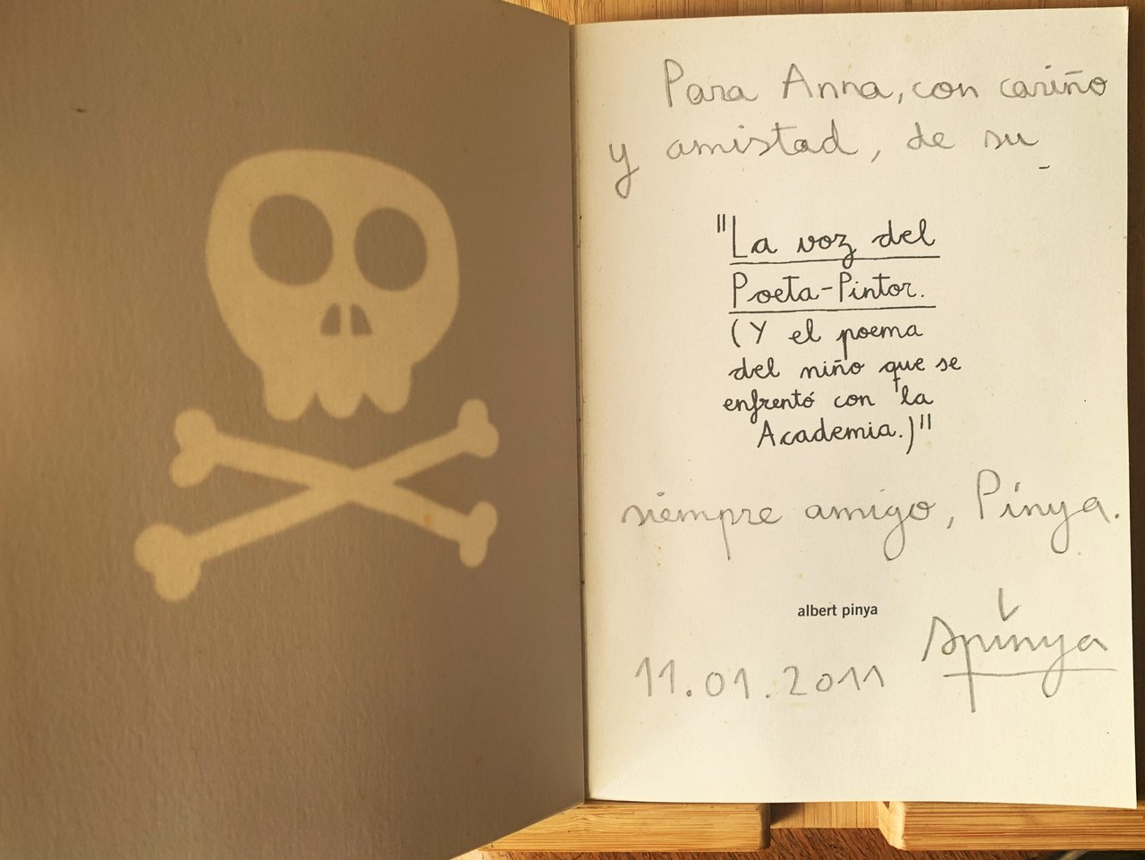 I ed. con tiratura limitata: "Se han impreso un total de 150 ejemplares, numerados y firmados por el autor. De estos ejemplares, 50 están numerados en romanos, del 1 al 100. Este libro se terminó de imprimir el 28 de junio de 2010, en Palma" (Ejemplar n^ 97, firmados por el autor). Testo in spagnolo. Editor: Joan Rafael Bonet. In-8, pp. 144, brossura in cartoncino estenamente nero con titoli in bianco al dorso, marchio dell'editore sempre ijn bianco all'ultimo e piatto e al primo piatto in bianco il motivo del "teschio e tibie incrociate" ("skull and crossbones"). Diseño y maquetación: Aníbal Guirado. In frontespizio (p. 1) dedica a matita firmata e datata dall'artista. Stato buono-ottimo. ?ndice (Indice): Presentación (Experencia "picto"literaria (o una piedra mohosa entre dos charcos marrones)); Joan Rafael Bonet y Albert Pinya - Prológo (La palabra pintada; Emili Sánchez-Rubio) - La voz del Poeta-Pintor.; Albert Pinya - Y el poema del niño que se enfrontó con la Academia.