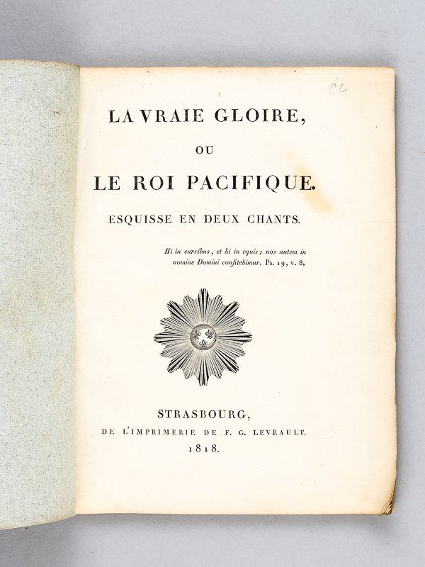 1 brochure sous papier fort, De l'imprimerie F.G. Levrault, Strasbourg, 1818, 16 pp. Ode célébrant le retour des Bourbons. Bon état (couv. lég. frotté, bon intérieur). Peu courant.