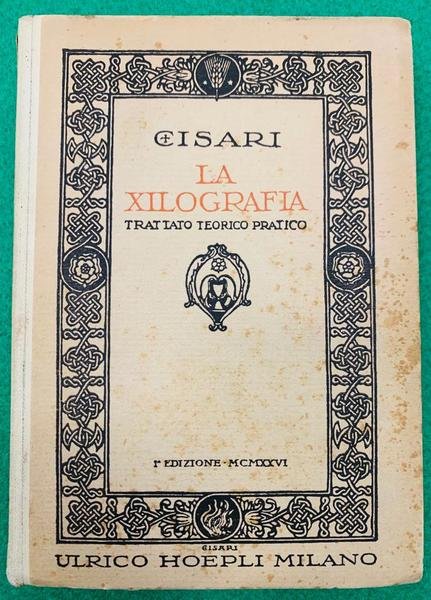 In 16°; (4 b.), 117, (3) pp. e LXII c. di tav. fuori testo. Legatura editoriale in mezza tela con titolo in rosso e nero entro ricca cornice xilografica al piatto anteriore. Al dorso titolo e autori impressi in nero. Qualche lievissimo foxing al margine esterno del piatto anteriore e nel complesso in ottime condizioni di conservazione. Prima edizione di questo manuale Hoepli dedicato alla storia ed alla tecnica dell'incisione xilografica.