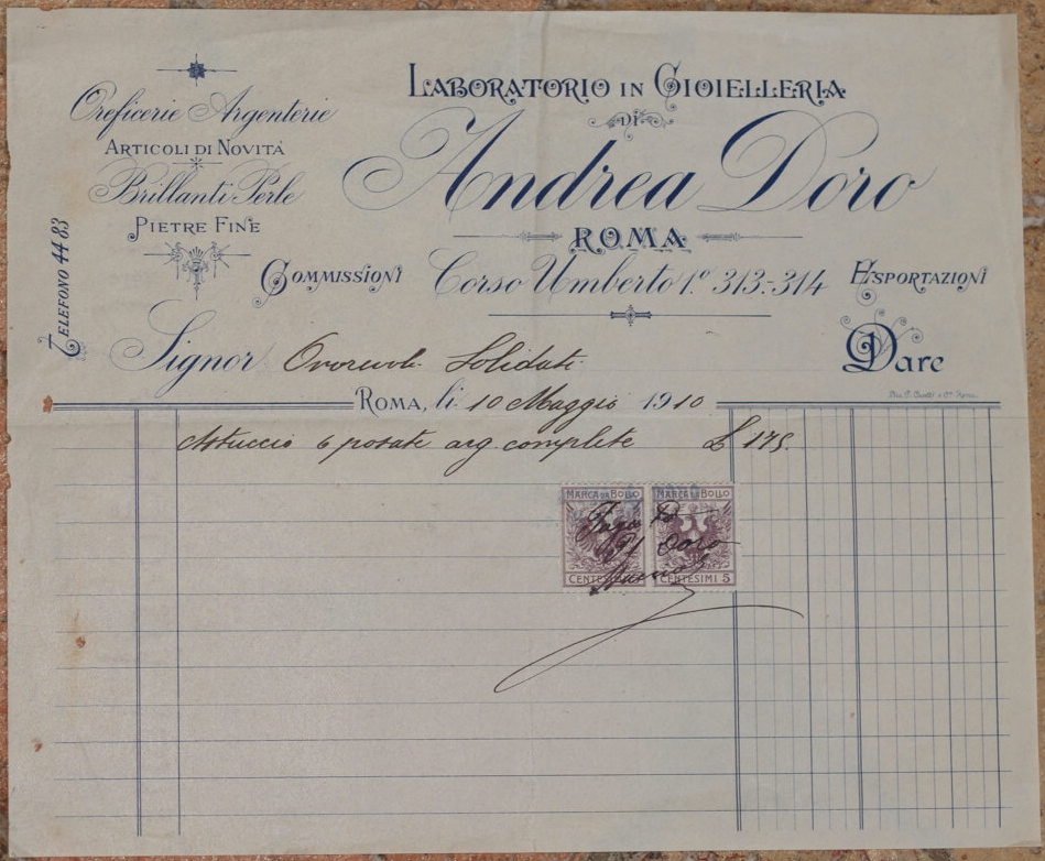 Bella fattura del 10 maggio 1910 della gioielleria "Andrea Doro" di Roma. Lista del materiale acquistato con i prezzi e marca da bollo. In buone condizioni, piegature. Dim. cm 19x22,5. Beautiful invoice of the 10th of may 1910 of the jewellery "Andrea Doro" in Rome. List of material and price. In good conditions, foldings.