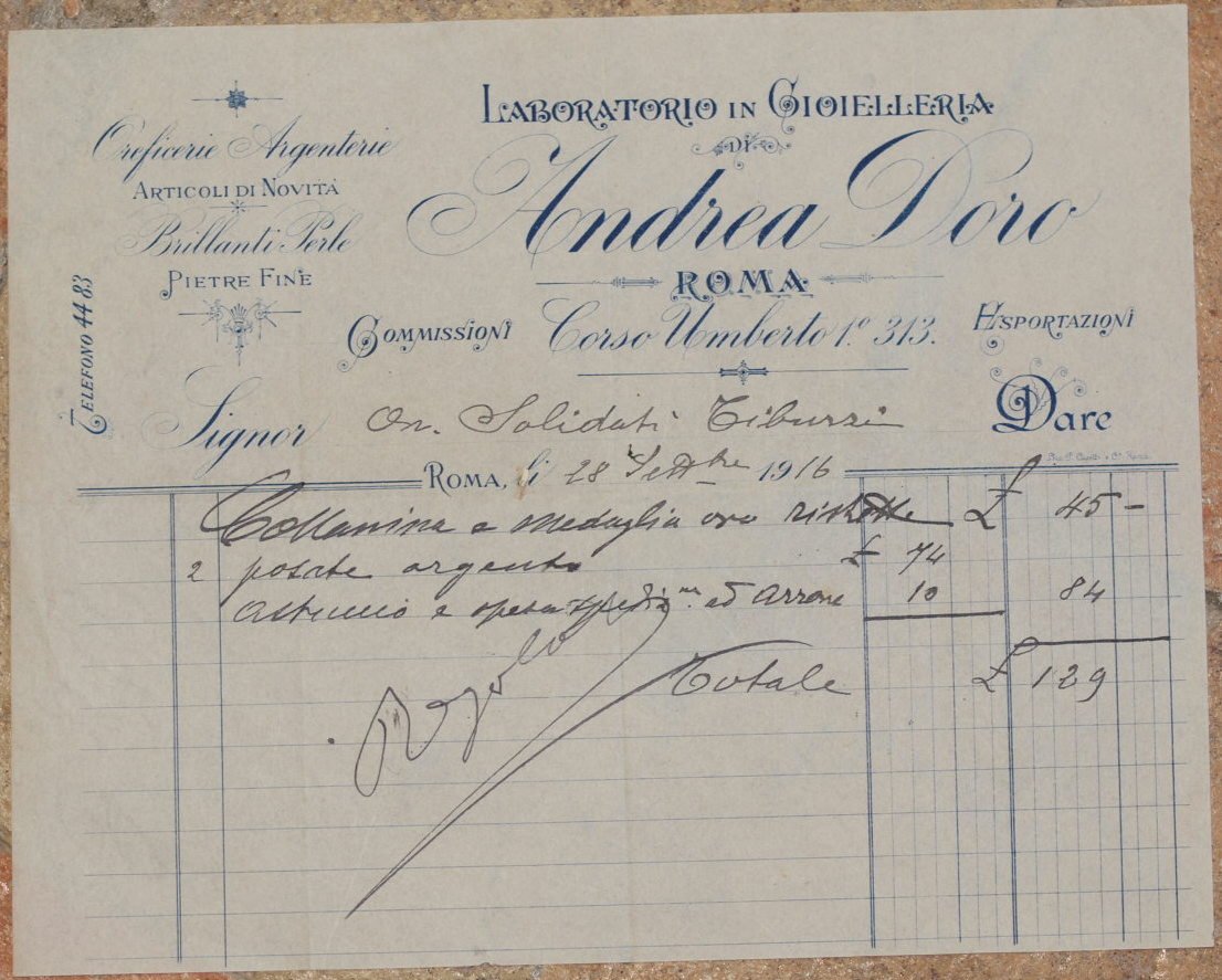 Rara fattura del 28 settembre 1916 della gioielleria "Andrea Doro". Lista degli oggetti acquistati (collanina, posate in argento). In buone condizioni, piegature. In 8. Dim. cm 18,5x23. Beautiful invoice of the 28th of september 1916 of the jewellery shop "Andrea Doro". List of items purchased. In good conditions, foldings.