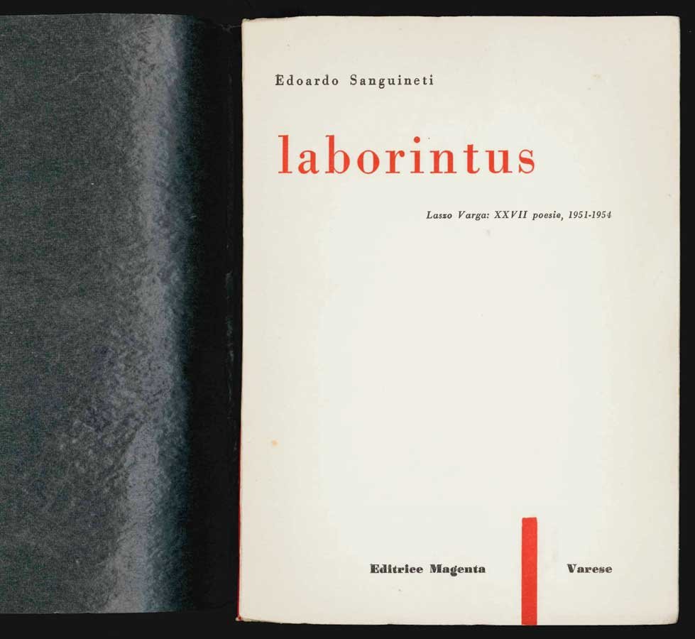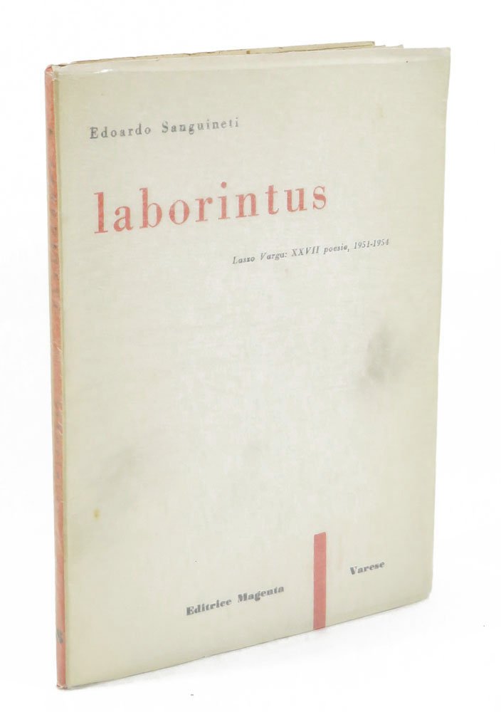 LIBROEdizione originale.Più che buon esemplare (mancanze al dorso del pergamino, leggera bruniture e fioriture alle carte). Firma di possesso «Luciano Perez 1957» al frontespizio. Aggiunte a matita le date di composizione delle singole sezioni dell’opera.Opera prima di Edoardo Sanguineti, parte di un progetto che si dispiegherà completamente con i successivi «Opus metricum» (1960) e «Triperuno» (1964). La silloge – che prende il titolo dall’opera di arte poetica medievale di Everardo Alemanno – con il suo lavoro sul linguaggio e i suoi codici e con il suo andamento caotico, fu accolta da Pasolini – che aveva in verità, almeno inizialmente, recensito con toni meno critici il lavoro di Sanguineti – come un “furentissimo pastiche” in cui confluivano temi tanto post-ermetici quanto pre-ermetici. Un esempio, per il Pasolini sostenitore di una propria personale via alla sperimentazione, di “neo-sperimentalismo” carico di rimandi ma povero, in definitiva, di prospettiva. Ma ancor più netto fu il giudizio di Andrea Zanzotto che – secondo quanto riportato in una nota anonima pubblicata su «Officina» nel novembre 1957 – definì «Laborintus» “la trascrizione di un esaurimento nervoso”. Nel saggio «Poesia informale?» - pubblicato nel numero 3 del 1961 di «Il Verri» - Sanguineti chiarì in questo modo le ragioni dietro l’opera: «Si trattava per me di superare il formalismo e l’irrazionalismo dell’avanguardia (e infine la stessa avanguardia, nelle sue implicazioni ideologiche), non per mezzo di una rimozione, ma a partire dal formalismo e dall’irrazionalismo stesso, esasperandone le contraddizioni sino a un limite praticamente insuperabile, rovesciandone il senso, agendo sopra gli stessi postulati di tipo anarchico, ma portandoli a un grado di coscienza eversiva. Il Laborintus era insomma la descrizione di uno straniamento sofferto con la coscienza dello straniamento e, anzi di uno straniamento inoculato volutamente, se possibile, in dose particolarmente massiccia, a scopo analitico-sperimentale: patetico e patologico erano termini che agivano in stretta congiunzione tra loro e con una coscienza che, a non dire altro, conosceva, del patetico e del patologico, la congiunzione etimologica. E parlo di etimo storico, e non di semplice etimo filologico: parlo nel senso radicale (strutturale) del materialismo storico».Bibl.:. «Una polemica in prosa», in «Officina», 11, novembre 1957; E. Sanguineti, «Poesia informale?», in «Il Verri» 3, 1961.