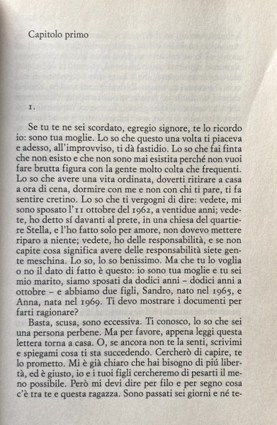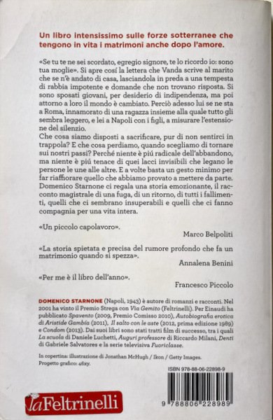 «Se tu te ne sei scordato, egregio signore, te lo ricordo io: sono tua moglie». Si apre così la lettera che Vanda scrive al marito che se n'è andato di casa, lasciandola in preda a una tempesta di rabbia impotente e domande che non trovano risposta. Si sono sposati giovani all'inizio degli anni Sessanta, per desiderio di indipendenza, ma poi attorno a loro il mondo è cambiato, e ritrovarsi a trent'anni con una famiglia a carico è diventato un segno di arretratezza più che di autonomia. Perciò adesso lui se ne sta a Roma, innamorato della grazia lieve di una sconosciuta con cui i giorni sono sempre gioiosi, e lei a Napoli con i figli, a misurare l'estensione del silenzio e il crescere dell'estraneità. Che cosa siamo disposti a sacrificare, pur di non sentirci in trappola? E che cosa perdiamo, quando scegliamo di tornare sui nostri passi? Perché niente è più radicale dell'abbandono, ma niente è più tenace di quei lacci invisibili che legano le persone le une alle altre. E a volte basta un gesto minimo per far riaffiorare quello che abbiamo provato a mettere da parte. Domenico Starnone ci regala una storia emozionante e fortissima, il racconto magistrale di una fuga, di un ritorno, di tutti i fallimenti, quelli che ci sembrano insuperabili e quelli che ci fanno compagnia per una vita intera.