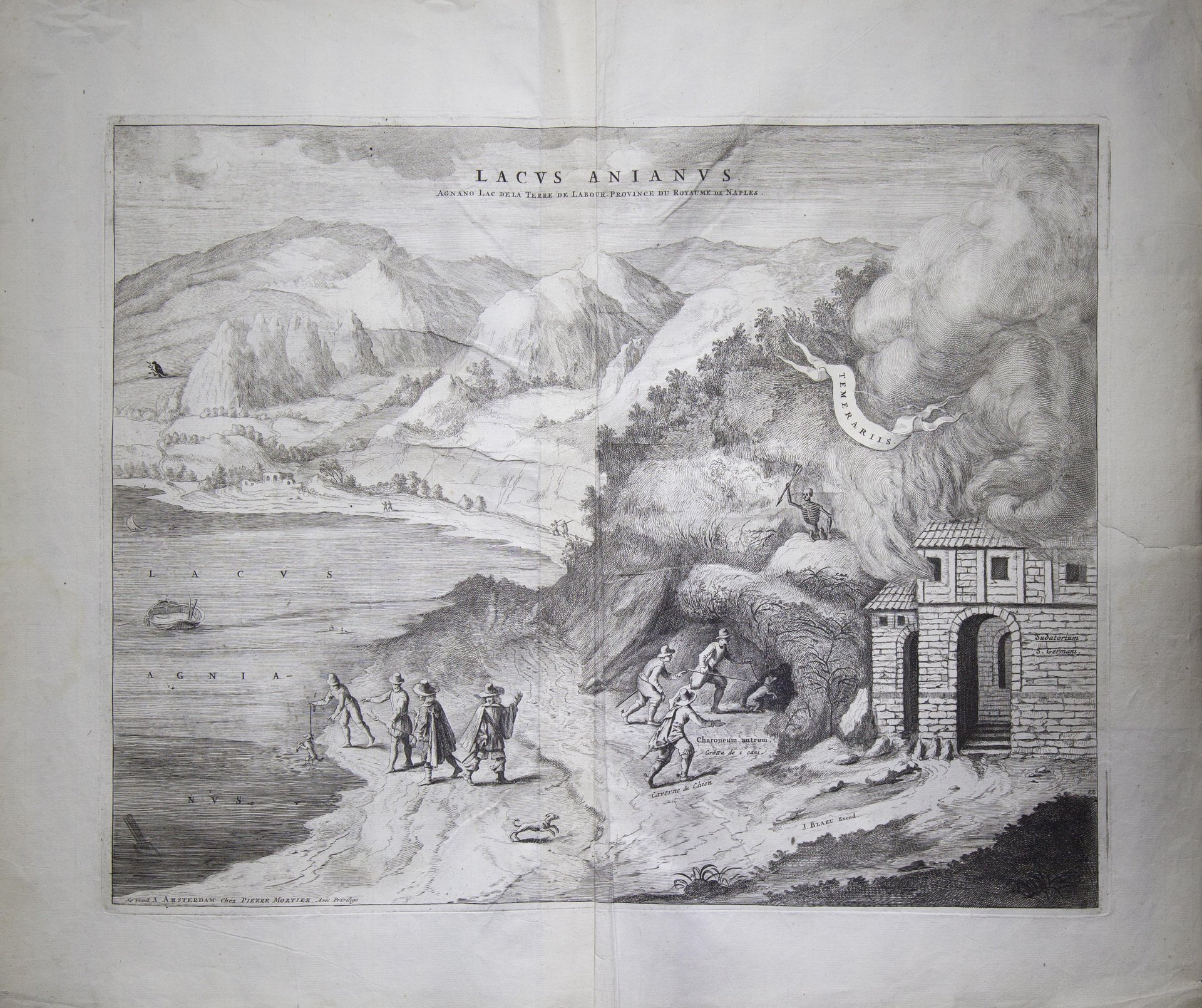 Tratta da "L`Atlas Maior. Incisione con piegatura centrale di mm. 540 x 420 circa (=lxh) pi˘ ampi margini. Firmata in basso a sinistra Pierre Mortier. Con personaggi in primo piano, la Grotta del Cane (Charoneum antrum) e il Sudatorium S. Germani. L`Atlas Maior (o Atlas Novus, come veniva chiamato nelle prime edizioni) un atlante completo del mondo ideato da Willem Blaeu ma redatto dal figlio Joan Blaeu e completato nel 1665. Il libro originale, scritto in latino, consisteva di 11 volumi e conteneva 594 mappe. In origine, il titolo completo era Theatrum Orbis Terrarum, sive Atlas Novus in quo Tabulae et Descriptiones Onminum Regionum, ci derivava dal fatto che l`atlante si basava su un`opera di Abraham Ortelius del 1570, dal titolo Theatrum Orbis Terrarum. Riparato il margine destro, tracce di vecchia umidit‡.