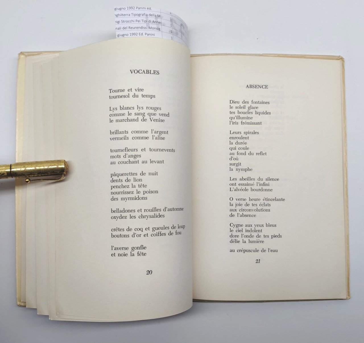 sovraccoperta in acetato con alcune lievi sporcizie, legatura morbida editoriale, tagli leggermente ingialliti, in francese, il numero pagine 57 dimensioni cm 21,9 * 14,4