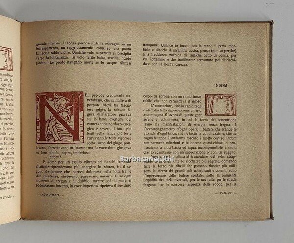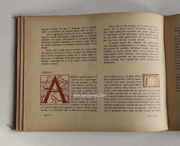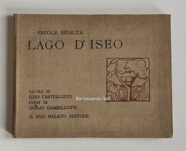 Bel volume dedicato al lago d'Iseo con testi di Ercole Rivalta (scrittore e giornalista nato nel 1875) decorati con capilettera e fregi di Duilio Cambellotti (1876-1960).