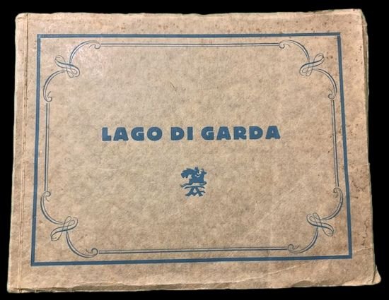 In oblungo (24x19 cm), 10 cc. nn. Brossura editoriale con titolo impresso in azzurro al piatto anteriore entro bella cornice. Ogni cartolina ha formato grande (uscirono anche in formato di cartolina classica) e misurano 18x13,7 cm ed è applicata allalbum entro una cornice rossa con sotto riportato il titolo della località riprodotta. Le 10 cartoline riguardano: Torbole, Arco, Riva, Malcesine, Cargnano col Monte Baldo, Panorama di Maderno verso Toscolano e Monte Baldo, ,Gardone-Riviera, Salò con la Riviera, Il castello di Sirmione, Punta S. Vigilio. Ogni cartolina è a colori. Album in perfette condizioni di conservazione e assai rara da reperirsi. L'opera è forse un album ricordo o un campionario pubblicitario di cartoline che venivano poi ordinate e stampate in formato classico di cartolina (le stesse infatti si trovano in formato più piccolo). Completo e RARO.