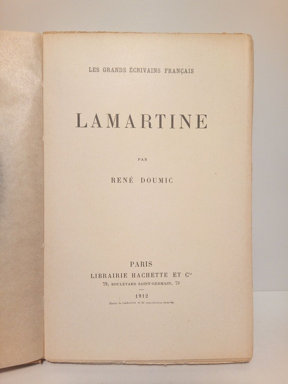 Paris: Librairie Hachette et Cie., 1912.- 205 p., [1 h.]: Con un retrato grabado de Lamartine ante portada; 8º (18,7 x 12 cm); Intonso; Texto en francés; Rústica Ed.- (Les Grands Ecrivains Français).* Mínima falta en la cabeza de la lomera. El papel del grabado oscurecido por su composición química LITERATURA Y ESTUDIOS LITERARIOS EXTRANJEROS DE LOS SIGLOS XVI-XXI
