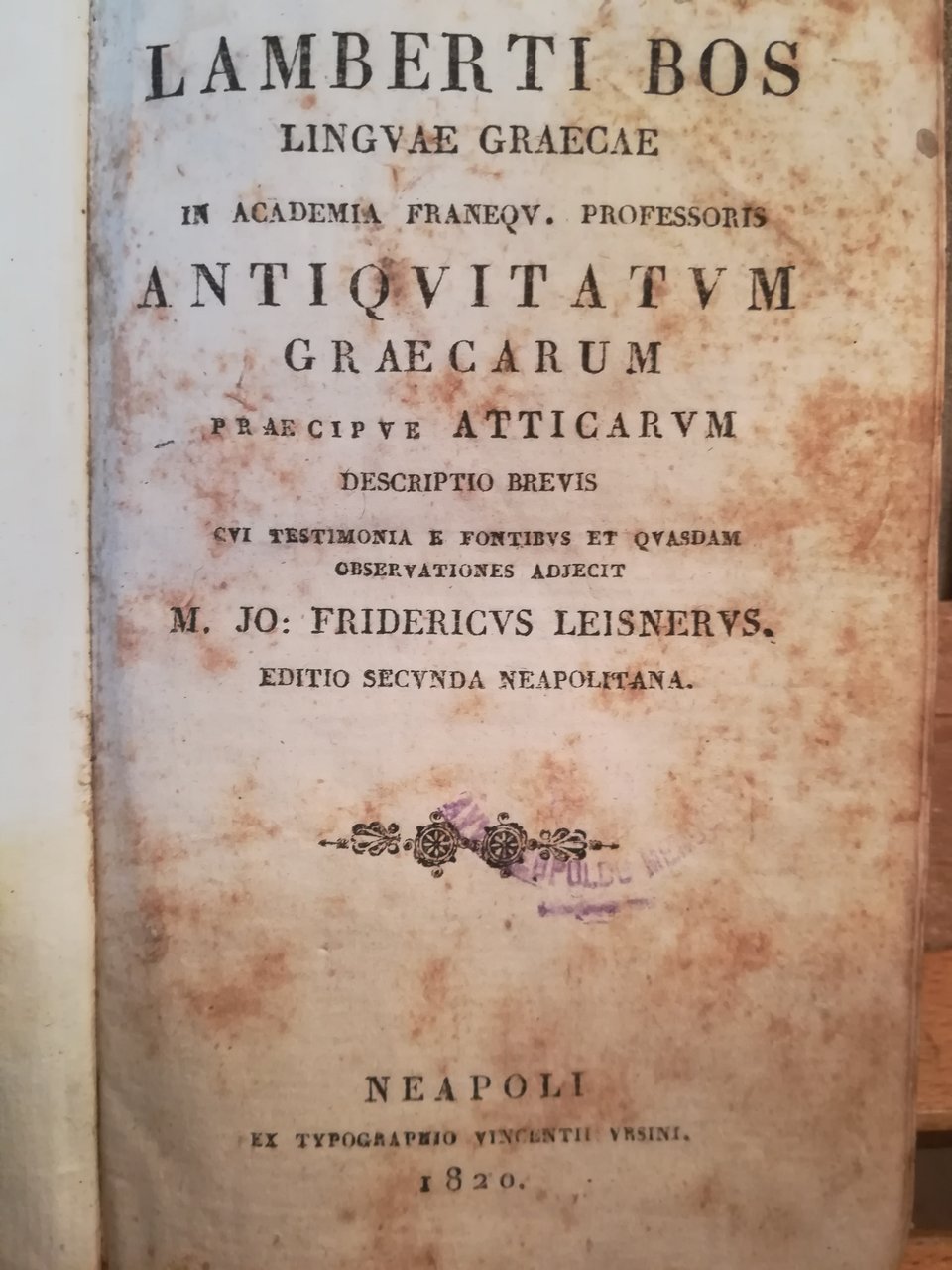 Copertina: in piena pelle, con segni d'usura ai margini. Rarissima miscellanea di cose e personaggi della Grecia antica. Rarissimo. Mediocre (Poor) .