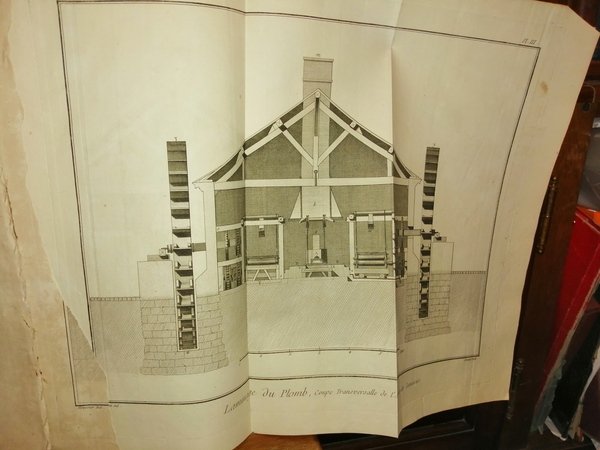 In-folio (39,5 cm) 6 III-XII c. (di tav.). Cartoncino con carta marmorizzata. Tavole disegnate daGoussier e incise da Benard. Mancano le tavole I-II.Proviene da Encyclopédie ou Dictionnaire raisonné des sciences, des arts et des métiers, opera enciclopedica in 35 voll., di cui 11 di tavole, pubblicata a Parigi tra il 1751 e il 1772. Diretta da D. Diderot, intendeva esporre i progressi compiuti dall'umanità in tutti i campi, con particolare riguardo alla tecnica. Le voci furono scritte da letterati, specialisti, medici e ingegneri, tra cui J.-B. D'Alembert, Voltaire, C. Montesquieu, J.-J. Rousseau, E. Condillac. "Recueil de Planches, sur les sciences, lse arts liberaux, et les arts mechaniques, avec leur explication. Septieme livraison, ou huitieme volume. 254 planches. A Paris, chez Briasson, rue Saint Jacques, à la Science, 1771". French language. Lingua francese