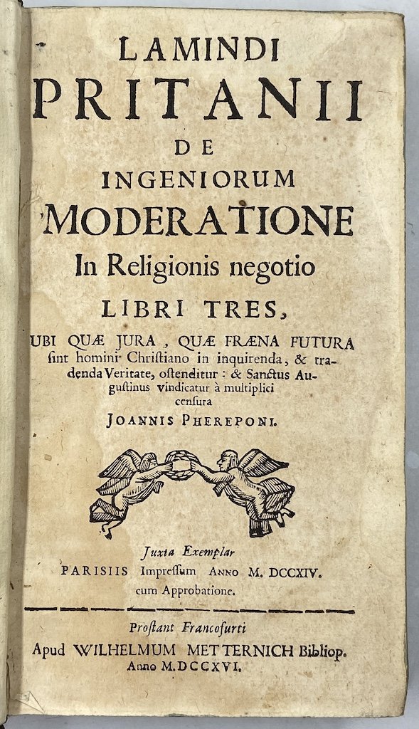 LAMINDI PRITANII DE INGENIORUM MODERATIONE In Religionis negotio LIBRI TRES, UBI QUÆ JURA, QUÆ FRÆNA FUTURA sint homini Christiano in inquirenda, & tradenda Veritate, oltenditur: & Sanctus Augustinus vindicatur a multiplici censura JOANNIS PHEREPONI. Justa Exemplar PARISIIS Impressum ANNO M.DCCXIV cum Approbatione. Prostant Francofurti Apud WILHELMUM METTERNICH Bibliop. Anno M.DCCXVI. [1716]