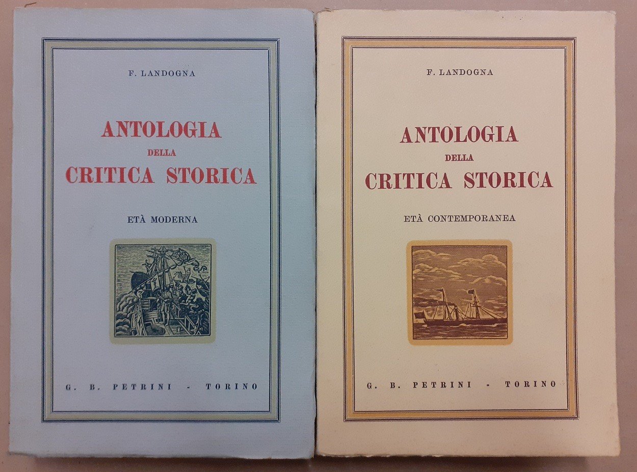Franco Landogna, Antologia della critica storica. Età moderna. In appendice: Guida bibliografica sui principali problemi di critica storica, G. B. Petrini, Torino 1966, quattordicesima ed., pp. 544, cm 21, br. ed. In lotto con: Franco Landogna, Antologia della critica storica. Età contemporanea. In appendice: Guida bibliografica sui principali problemi di critica storica, G. B. Petrini, Torino 1967, quindicesima ed., pp.638, cm 21, br. ed. Il lotto comprende i volumi secondo e terzo dell’opera Antologia della critica storica di Franco Landogna, relativi rispettivamente a Età moderna ed Età contemporanea. Leggere tracce d’uso alle brossure, minima brunitura della carta, per il resto esemplari in ottimo stato.