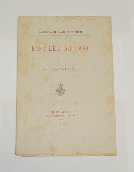 Giovanni Lanzalone, Echi leopardiani, Editore Albano Tacoli, Cologna Veneta 1897, pp. 44, cm 18, br. ed. Collana Raccolta di lavori letterari. Fioriture alla brossura, firma di appartenenza al margine superiore della copertina, per il resto buon esemplare.