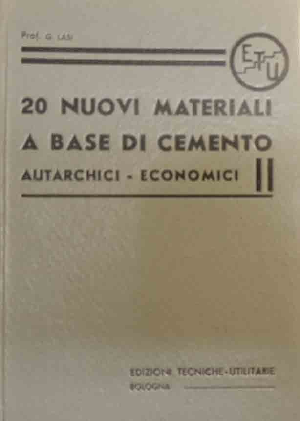 Gaspare Lasi, 20 nuovi materiali a base di cemento. Autarchici, economici, Edizioni Tecniche-Utilitarie, Bologna s.d. (1940?), pp. 164, ill. b.n., cm 18, cart. ed. con titoli al dorso e al piatto. Indice delle parti: Conglomerati pesanti e resistenti – Agglomerati leggeri e isolanti – Appendice (Apparecchio per la misura del coefficiente di trasmissione termica dei materiali edili). Ben conservato.