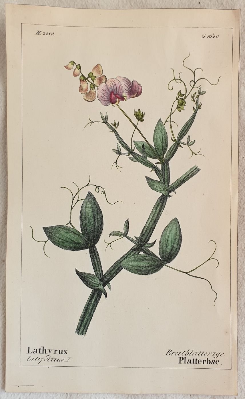 Bella cromolitografia del 1843 che rappresenta il Lathyrus latifolius tratta dalla celebre opera di botanica "Flora der Schweiz" di Heinrich Romer sulla flora della Svizzera.<BR>In buone condizioni, qualche fioritura. Segni di colla al verso. TECNICA: Cromolitografia DIMENSIONI FOGLIO: cm 17,5x11 DIMENSIONI INCISIONE: cm 15,5x9,5 EPOCA: 1843 CONDIZIONI: Buone condizioni, qualche fioritura. Piccoli strappi al margine inferiore. Resto di colla al verso. Beautiful chromolythography of 1843 representing broad leaved sweet pea taken form the famous work of botany "Flora der Schweiz" by Heinrich Romer about flowers of Switzerland.<BR>In good conditions, some foxings. Glue signs in the verso of page. TECHNIQUE: Lytography PAGE SIZE: cm 17,5x11 PRINT'S SIZE: cm 15,5x9,5 PERIOD: 1843 CONDITION: good conditions with some foxings. Little tears in the lower edge. Glue signs in the verso of page.