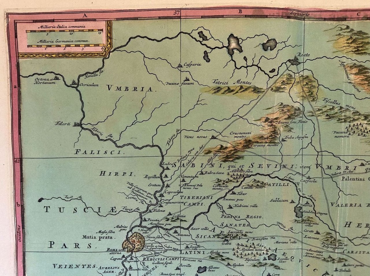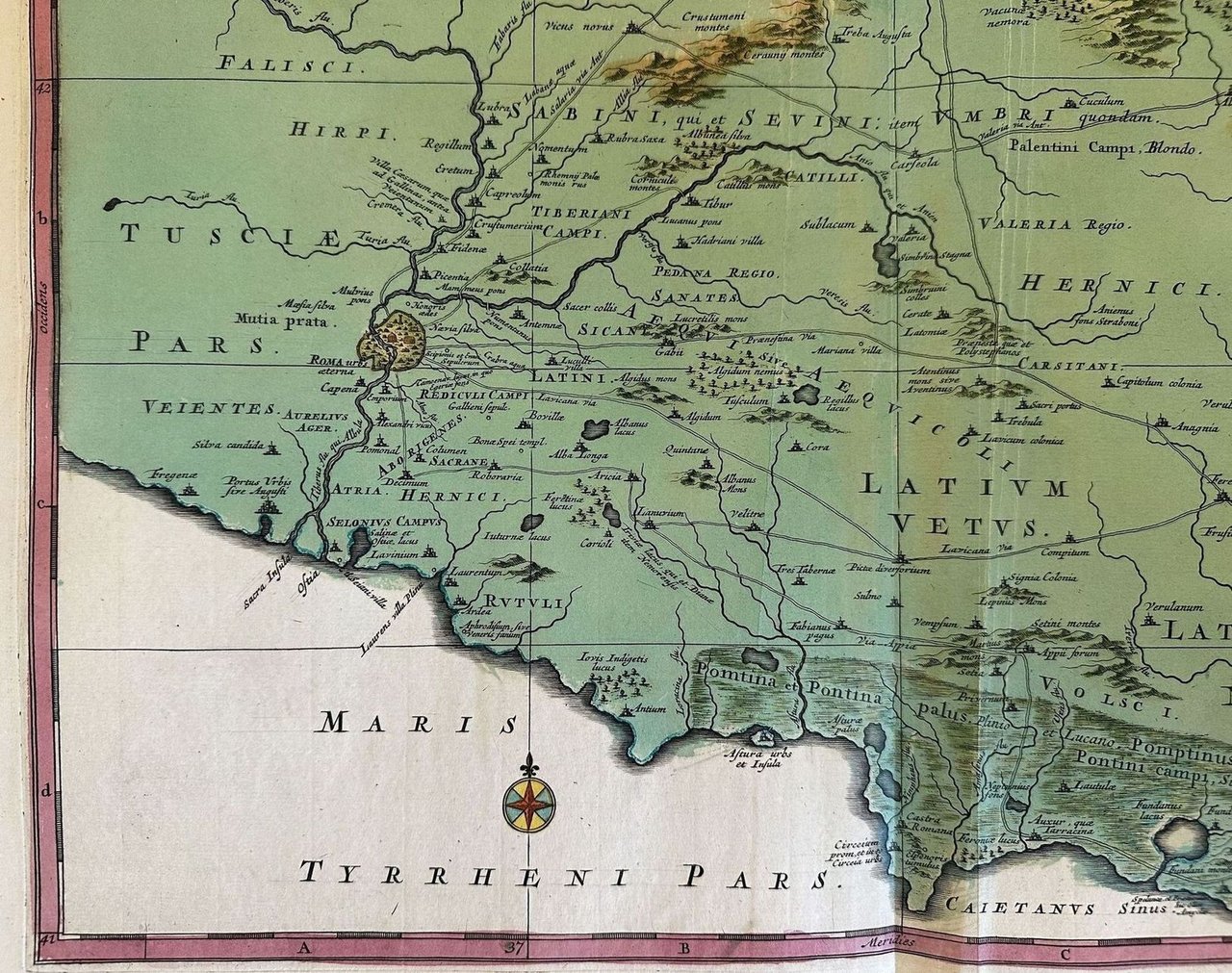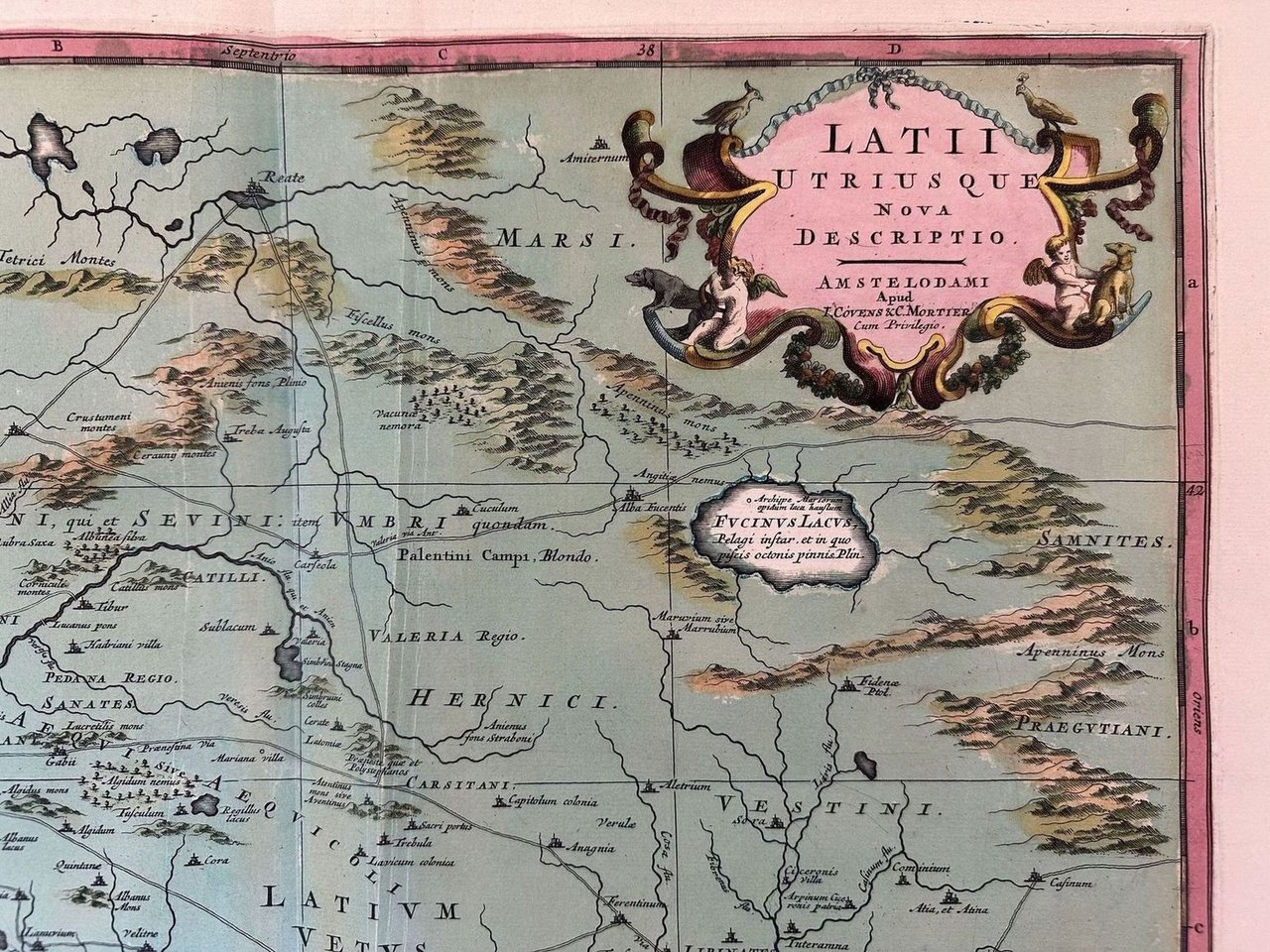 Mappa dettagliata della regione Lazio edita da Covens e Mortier (1721-c. 1862) stamperia di Amsterdam successore di Pierre Mortier (1661-1711). Alla morte di Pierre Mortier la casa editrice venne rivelata dal figlio che la gestì insieme al cognato Johannes Covens (1697-1774). Pubblicarono migliaia di mappe con permesso. Indicazione dei monumenti nella città di Roma, montagne e strade di collegamento. La mappa è stata acquarellata a mano. Testo in lingua latina. In buone condizioni. AUTORE: Covens e Mortier (1721-1778) DATA: 1721-1778 TECNICA: Acquaforte su rame DIMENSIONI DEL FOGLIO: cm 62X53 DIMENSIONI INCISIONE: cm 49x36,5 CONDIZIONI: Buone. Piegatura verticaleVery detailed map of Lazio region edited by Covens and Mortier (1721-c. 1862) publisher in Amsterdam successor of Pierre Mortier (1661-1711). When Pierre Mortier died the editor house was taken by his son with Johannes Covens (1697-1774) the brother of his wife. They published has been coloured by hand. Indication of monuments in the city of Rome, mountains and streets. In good conditions. AUTHOR Covens e Mortier (1721-1778) DATA: 1721-1778 TECHNIQUE: Copper etching PAGE SIZE: cm 62X53 PRINT'S SIZE: cm 49x36,5 CONDITIONS: Good conditions. Vertical folding