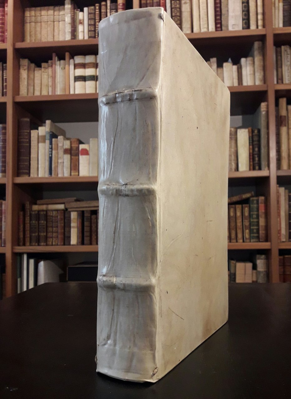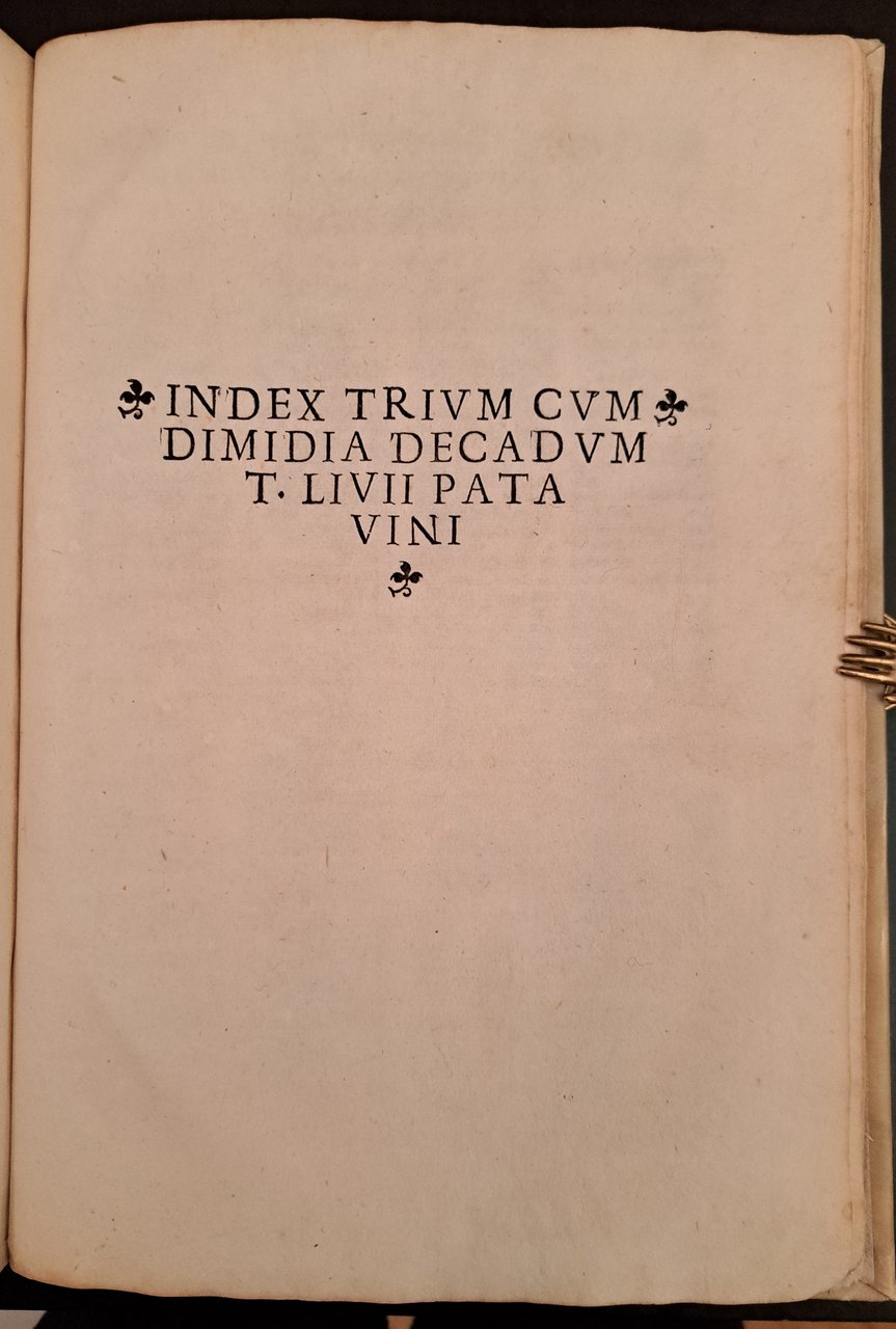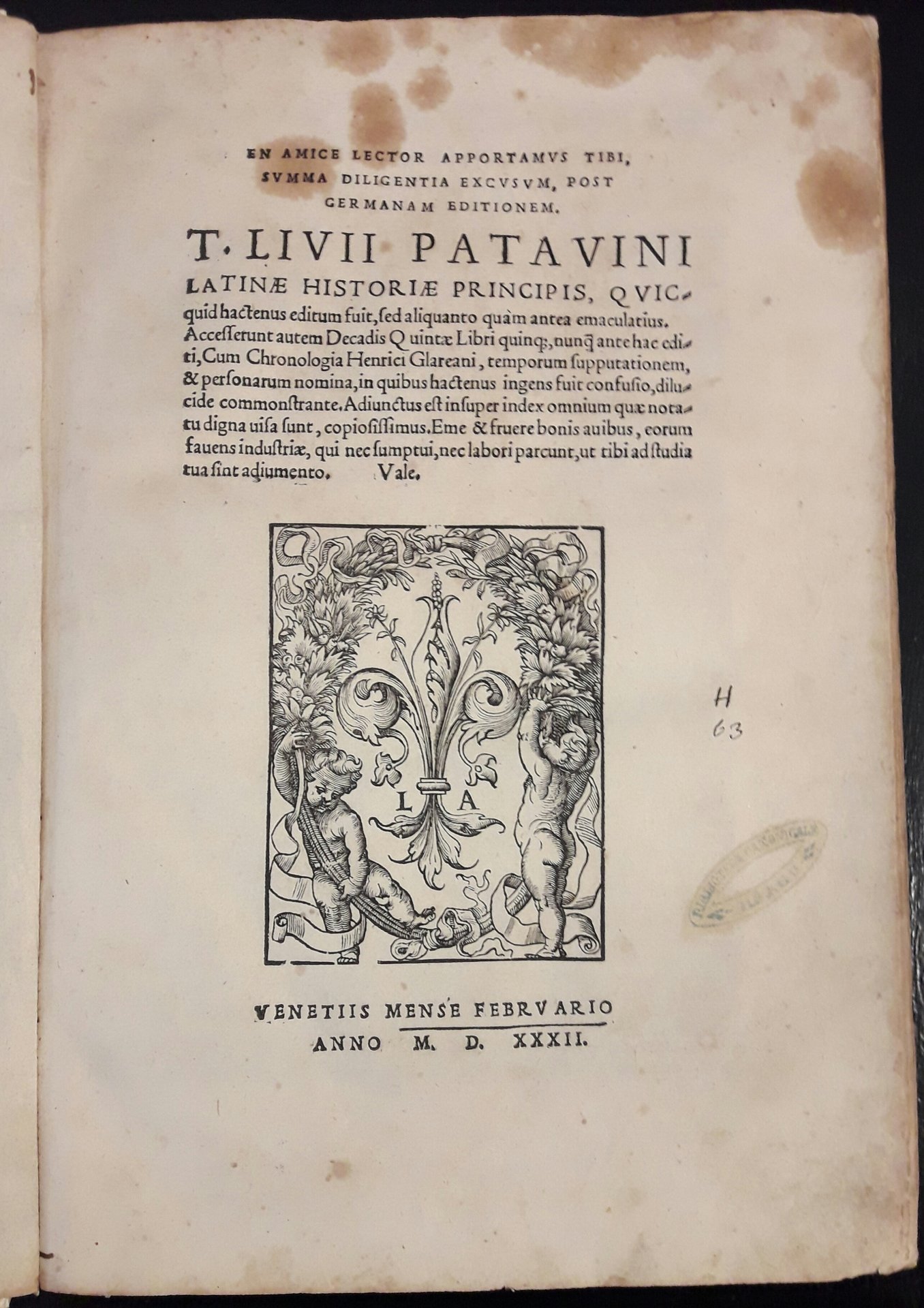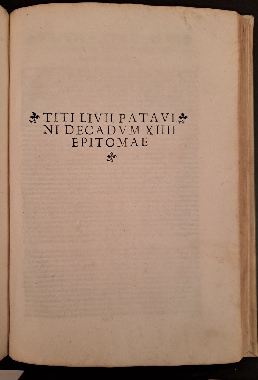 In folio (31,1x21,4), cc.nn. 4, numerate 312 (col registro), pp. 16 (Decadum XIIII Epitomae). Seguono, con la Chronologia di Glareano e gli indici, 40 cc.nn., con il loro registro in fine. Al frontespizio e al verso dell'ultima carta, grande marchio tipografico con il giglio. Bei capilettera figurati. Importante edizione in buon esemplare, ristampa dell'edizione del 1531, la prima a contenere i cinque libri della quinta Decade. Qualche macchia marginale nelle prime carte e in alcune altre. Buoni margini. Annotazioni antiche ai margini di 16 cc. Legatura settecentesca in pergamena con nervature al dorso. (Adams, L 1328; renouard, XXVIII, 108).