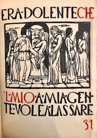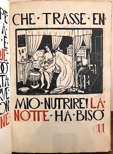 Folio (cm. 49), 55 pp., 2 cc.nn. Testo e lettere capitali in rosso e nero. Grandi incisioni linografiche n.t. in stile De Carolis, opera degli allievi dell’Istituto: Banchetti, Bulletti, Ceccherini, Falossi, Farulli, Grifoni, Guasti, Piacentini, Martellucci, Romoli, Sacchetti, Toti. Legatura d’origine in cartone rigido con al al centro dei piatti applicata un fitta tela di iuta (minime mancanze alle cuffie). Esemplare in ottimo stato di conservazione impresso su carta grave.