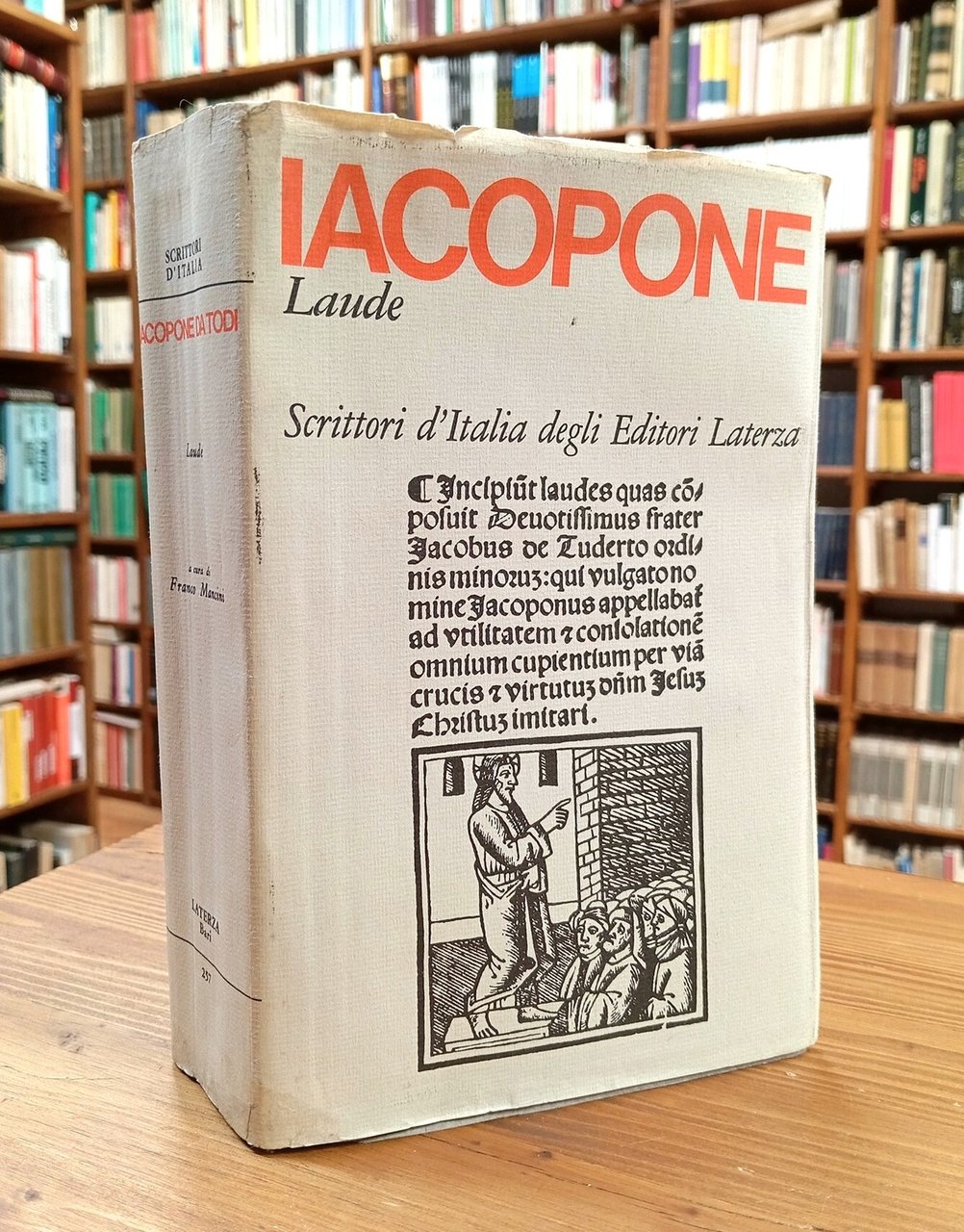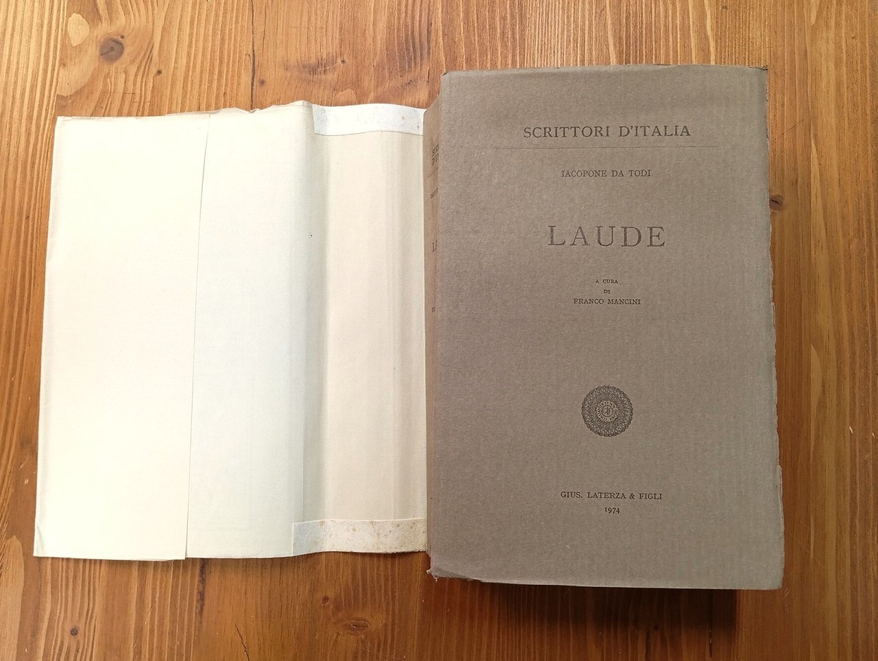 Collana "Scrittori d'Italia", 257. Al frontespizio, dedica e firma del curatore Franco Mancini - Brossura editoriale con sovraccoperta, 864 pagine. In chiusura indice dei nomi, dei capoversi, del laudario e indice topografico dei manoscritti citati nelle note. Restauri al risvolto interno della sovraccoperta; brossura un poco ondulata per l'uso; paginazione fresca e compatta. Nel complesso buona-ottima copia di questa importante edizione commentata delle Laude.