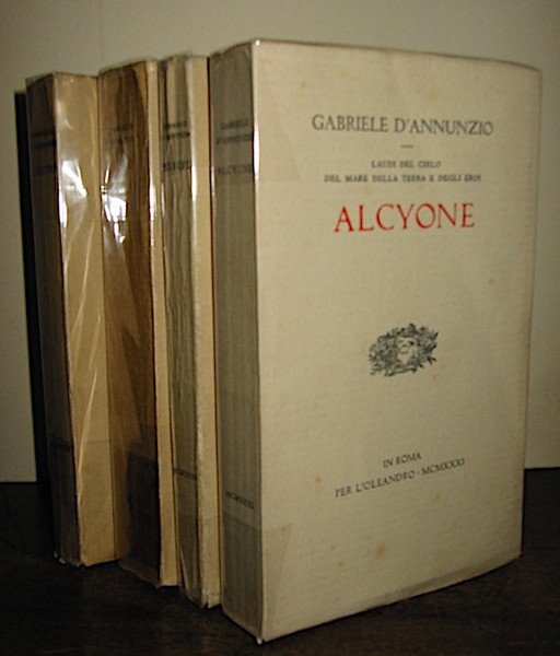 16mo (cm. 15,8), 4 Voll., X pp., 1 c.nn., 328 pp., 2 cc.nn.; X pp., 1 c.nn., 231(1) pp., 1 c.nn.; XI(1) pp., 383(1) pp., 1 c.nn.; VII(1) pp., 2 cc.nn., 174 pp., 1 c.nn. Bross. editoriali con titoli in rosso ed incisa in nero una corona di oleandri con la scritta ‘Così vivo’. Sulla cop. posteriore l’impresa ‘Io ho quel che ho donato’. Edizione stampata su carta distinta con filigrana e timbro a secco ‘Brilla di rose il lauro trionfale’. Ottimi esemplari numerati.