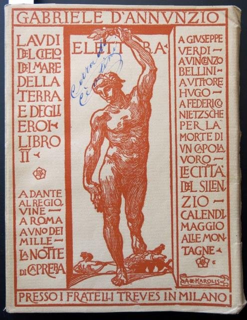 Fratelli Treves, Milano, 1914, ottavo migliaio. In 8vo largo, pp. 205, bross. orig. figurata in arancio ill. da A. De Karolis. Firma di coeva appartenenza in copertina e dedica al front. La composizione delle Laudi, che ricadono nel secondo periodo poetico di D'Annunzio, va dal 1903 al 1918. Pertanto trattasi di prima edizione. Molto buono lo stato di conservazione.
