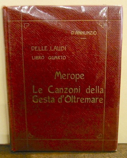 8vo (cm. 20), 4 cc.nn., 212 pp., 2 cc.nn. Frontespizio, decorazioni e fregi di Adolfo De Carolis. Legatura editoriale in tela rossa con titoli e cornice in oro al piatto anteriore. Titolo impresso al ds. Carta vergata con barbe. Firma di appartenenza sulla prima carta bianca. Ottimo esemplare. Seconda edizione, ma prima messa in vendita con la seguente dicitura all’occhietto: ‘La prima edizione delle Canzoni della gesta d’Oltremare fu sequestrata il 24 gennaio, a motivo di alcune terzine della Canzone dei Dardanelli, che, a detta dell’Autorità politica, suonano ingiuriose verso una potenza alleata e verso il suo Sovrano’. In questa nuova edizione, le suddette terzine sono soppresse, e surrogate dai puntini. A p. 114 fra i puntini si legge la seguente nota a stampa del Poeta: ‘Questa canzone della Patria delusa fu mutilata da mano poliziesca, per ordine del Cavalier Giovanni Giolitti capo del Governo d’Italia il dì 24 Gennaio 1912. G. d’A.’. De Medici, 77; Guabello, 182; Vecchioni, 42a.