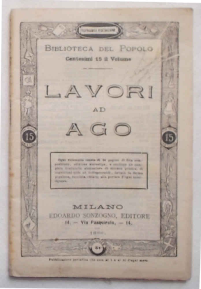 In 16° (cm. 16 x 11); pagg. 63; con oltre 90 incisioni n.t.; brossura origin. decorata. Firma. VG. ** Volume n. 1 della "Biblioteca del Popolo". Cucitura, ricami in bianco, lavori a maglia, all'uncinetto, a reticella.
