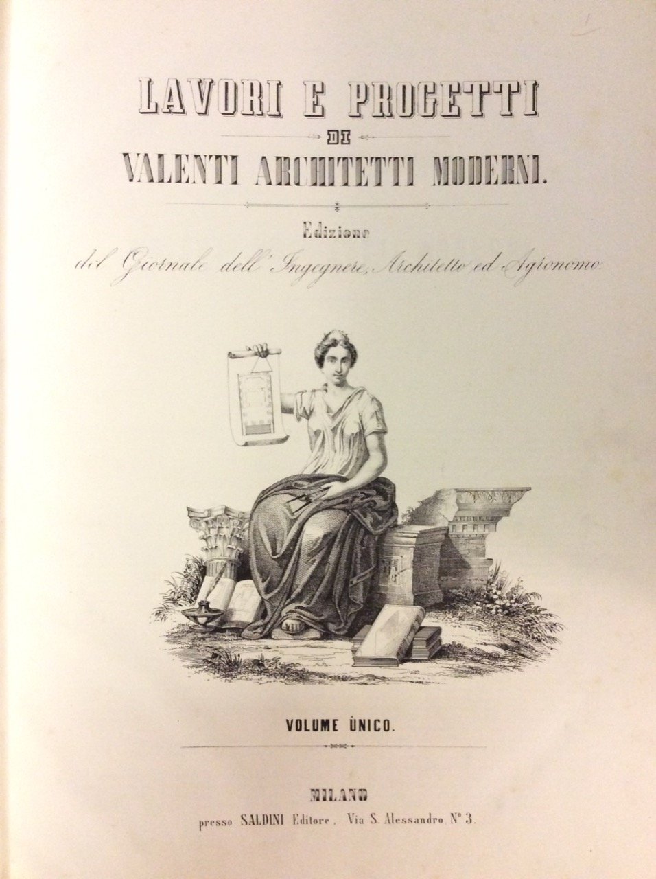 In folio max (mm. 528x380), mz. pelle coeva (con abras.), fregi e titolo oro al dorso, pp. 25, con 96 tavole inc. in rame, di cui 7 a doppia pag., incluso il bel frontespizio allegorico litografato. Importante raccolta di 38 progetti, per lo più di Luigi Voghera (noto architetto cremonese, 1788-1840), relativi a: una nuova strada Vittorio Emanuele a Milano - una Borsa per la città di Vienna - un cimitero monumentale per Milano - una nuova Dogana per Milano - un palazzo di città - un nuovo teatro per Bergamo - un fabbricato per pubblico Istituto di Equitazione (di Giovanni Voghera), etc. Esemplare ben conservato.
