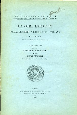 In-8°, pp. 43, brossura editoriale azzurra con stemma dell'Accademia dei Lincei. Firme di possesso del tempo. Alcune figure n.t. e 8 tavv. fototipiche f.t. con numerose figure raffiguranti scavi archeologici cretesi e reperti in essi rinvenuti. Ottimo stato. Rendiconti della R. Accademia dei Lincei. Classe di scienze morali, storiche e filologiche. Estratto dal vol. XV, serie 5a, fasc. 12°, seduta del 17 dicembre 1905.